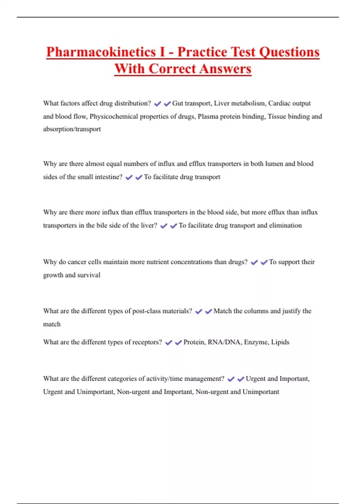 Pharmacokinetics I - Practice Test Questions With Correct Answers What factors affect drug distribution? Gut transport, Liver metabolism, Cardiac output and blood flow, Physicochemical properties of drugs, Plasma protein binding, Tissue binding and absorption/transport Why are there almost equal numbers of influx and efflux transporters in both lumen and blood sides of the small intestine? To facilitate drug transport Why are there more influx than efflux transporters in the blood side, but more efflux than influx transporters in the bile side of the liver? To facilitate drug transport and elimination