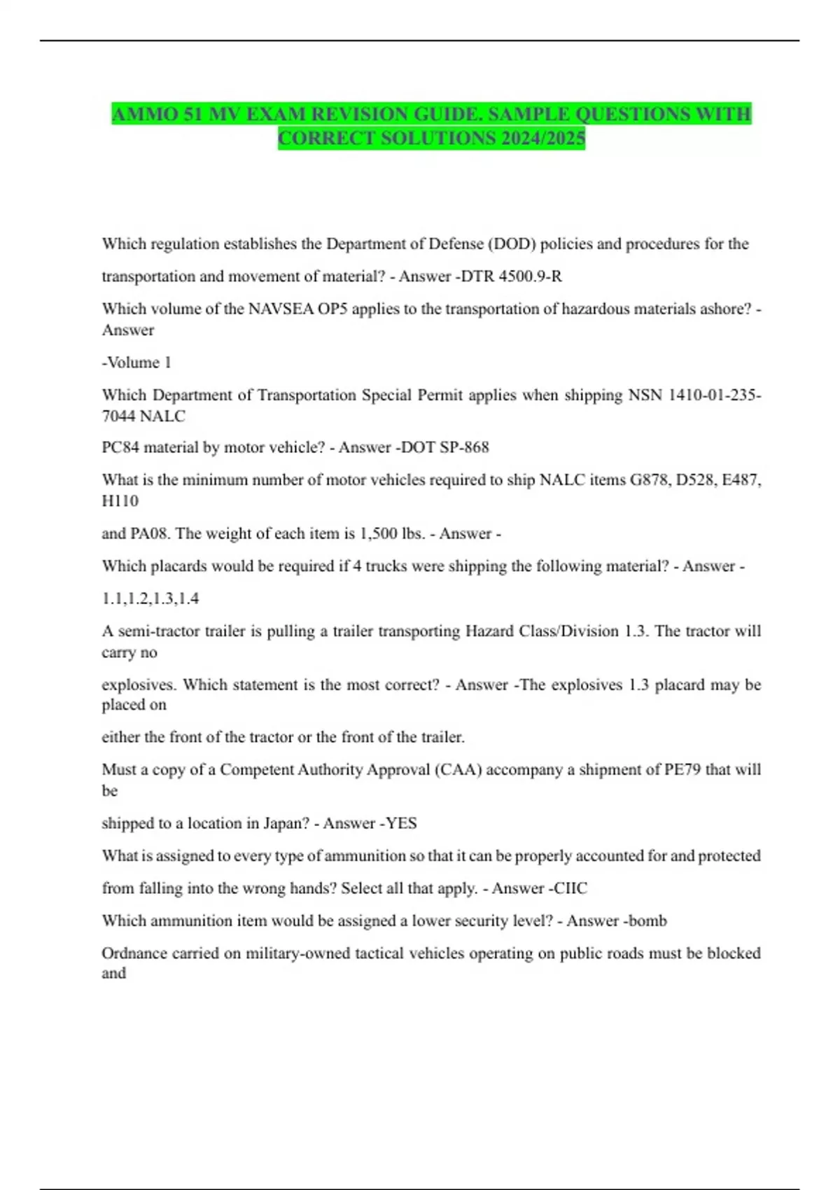 AMMO 51 MV EXAM REVISION GUIDE. SAMPLE QUESTIONS WITH