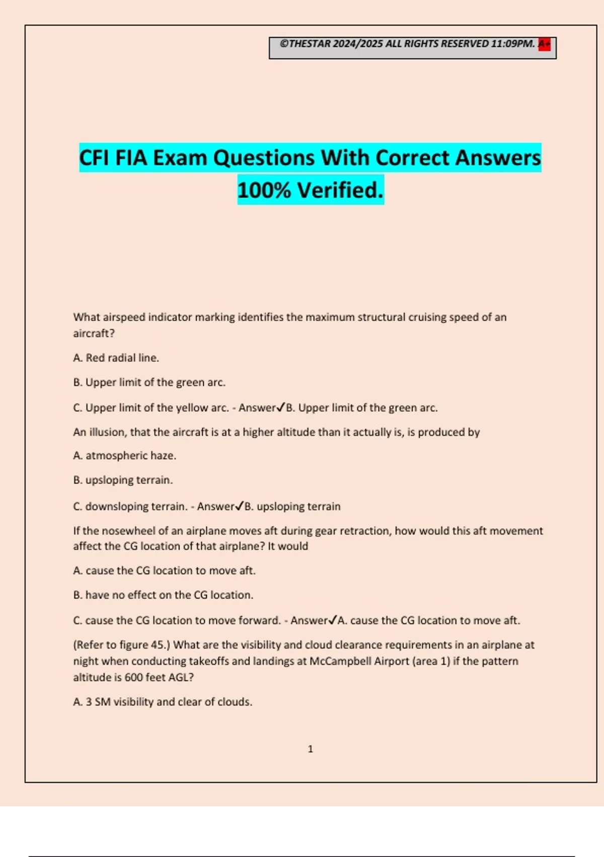 ©THESTAR 2024/2025 ALL RIGHTS RESERVED 11:09PM. A+ 1 CFI FIA Exam Questions With Correct Answers 100% Verified. What airspeed indicator marking identifies the maximum structural cruising speed of an aircraft? A. Red radial line. B. Upper limit of the green arc. C. Upper limit of the yellow arc. - AnswerB. Upper limit of the green arc. An illusion, that the aircraft is at a higher altitude than it actually is, is produced by A. atmospheric haze. B. upsloping terrain. C. downsloping terrain. - AnswerB. upsloping terrain If the nosewheel of an airplane moves aft during gear retraction, how would this aft movement affect the CG location of that airplane? It would A. cause the CG location to move aft. B. have no effect on the CG location. C. cause the CG location to move forward. - AnswerA. cause the CG location to move aft. (Refer to figure 45.) What are the visibility and cloud clearance requirements in an airplane at night when conducting takeoffs and landings at McCampbell Airport (area 1) if the pattern altitude is 600 feet AGL? A. 3 SM visibility and clear of clouds. ©THESTAR 2024/2025 ALL RIGHTS RESERVED 11:09PM. A+ 2 B. 1 SM visibility and clear of clouds if remaining within one-half mile of the airport. C. Remain clear of clouds and operate at a speed that allows adequate opportunity to see other traffic and obstructions in time to avoid a collision. - AnswerB. 1 SM visibility and clear of clouds if remaining within one-half mile of the airport. What would cause the 45° point to be reached before the maximum pitchup attitude during a lazy eight? A. Beginning with too slow a rate of roll. B. Beginning with too rapid a rate of roll. C. Allowing the airspeed to remain too high causing the rate of turn to increase. - AnswerB. Beginning with too rapid a rate of roll. If severe turbulence is encountered, the aircraft's airspeed should be reduced to A. maneuvering speed. B. normal structural cruising speed. C. the minimum steady flight speed in the landing configuration. - AnswerA. maneuvering speed. If the engine oil temperature and cylinder head temperature gauges have exceeded their normal operating range, you may have been A. operating with the mixture set too rich. B. using fuel that has a higher-than-specified fuel rating. C. operating with too much power and with the mixture set too lean. - AnswerC. operating with too much power and with the mixture set too lean. When using a Constant Pressure Analysis Chart for planning a flight at 10,000 feet MSL, a pilot should refer to the A. 850-millibar analysis. B. 700-millibar analysis. C. 500-millibar analysis. - AnswerB. 700-millibar analysis. Which training time must be certified by the instructor from whom it was received? A. Flight training. B. Flight training and training in a flight training device. ©THESTAR 2024/2025 ALL RIGHTS RESERVED 11:09PM. A+ 3 C. All flight training, flight simulator training, and ground training. - AnswerC. All flight training, flight simulator training, and ground training. (Refer to figure 45, area 5.) What is the elevation of the Thomas (T69) Airport? A. 122.8 feet MSL. B. 43 feet MSL. C. 48 feet MSL. - AnswerC. 48 feet MSL. (Refer to figure 14.) At what altitude is the freezing level over the middle of Florida on the 12- hour Significant Weather Prognostic Chart? A. 4,000 feet. B. 12,000 feet. C. 8,000 feet. - AnswerB. 12,000 feet. 12. What could be a result of a student focusing too far ahead during a landing approach? A. Reactions will be either too abrupt or too late. B. Rounding out too high and developing an excessive sink rate. C. Difficulty in judging the closeness of the ground resulting in a nose-first touchdown. - AnswerC. Difficulty in judging the closeness of the ground resulting in a nose-first touchdown. 13. What is the duration of a Student Pilot Certificate? A. Indefinite. B. 60 calendar months after the month in which it was issued. C. 24 calendar months after the month in which it was issued. - AnswerA. Indefinite. 14. Your student, who is preparing for a Private Pilot practical test in a single-engine airplane, received 3.5 hours of cross-country flight training including flights of 1.9 hours, 1.0 hours, and 0.6 hours. Is your student eligible to take the practical test? A. Yes. B. No. C. Yes but, if test is satisfactory, certificate will have an ICAO limitation on it. - AnswerA. Yes. 15. (Refer to figure 20.) At an airspeed represented by point B, in steady flight, the pilot can expect to obtain the aircraft's A. maximum coefficient of lift.