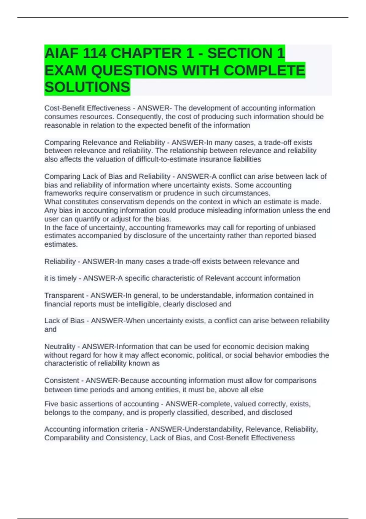Accounting information criteria - ANSWER-Understandability, Relevance, Reliability,