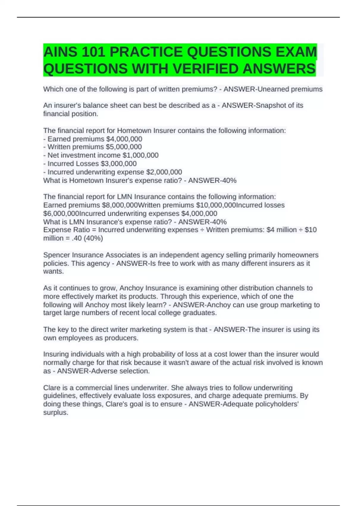 What is LMN Insurance's expense ratio? - ANSWER-40%