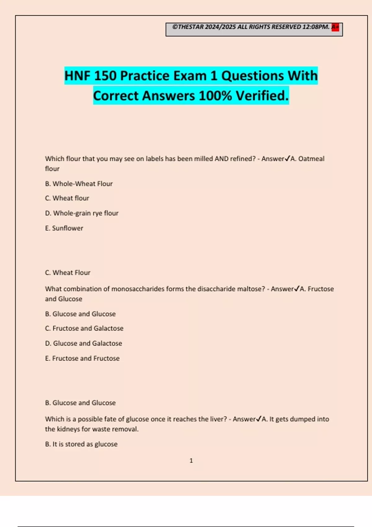 ©THESTAR 2024/2025 ALL RIGHTS RESERVED 12:08PM. A+ 1 HNF 150 Practice Exam 1 Questions With Correct Answers 100% Verified. Which flour that you may see on labels has been milled AND refined? - AnswerA. Oatmeal flour B. Whole-Wheat Flour C. Wheat flour D. Whole-grain rye flour E. Sunflower C. Wheat Flour What combination of monosaccharides forms the disaccharide maltose? - AnswerA. Fructose and Glucose B. Glucose and Glucose C. Fructose and Galactose D. Glucose and Galactose E. Fructose and Fructose B. Glucose and Glucose Which is a possible fate of glucose once it reaches the liver? - AnswerA. It gets dumped into the kidneys for waste removal. B. It is stored as glucose ©THESTAR 2024/2025 ALL RIGHTS RESERVED 12:08PM. A+ 2 C. It is used to make non-essential aminoacids. D. It is used to make cholesterol. C.It is used to make non-essential aminoacids Which of the following is not an example of fiber? - AnswerA. Fibrous skin of chicken wings B. Skins of corn kernels C. Pulp in orange juice D. "Strings" of celery E. Gel of corn grits A.Fibrous skin of chicken wings The stomach's main function in chemical digestion is to digest: - AnswerA. Carbohydrate B. Fat C. Protein D. Mucus E. Hydrochloric Acid C. Protein You are talking with someone who is trying to decrease his intake of saturated and trans fat. Which of the following items would you recom