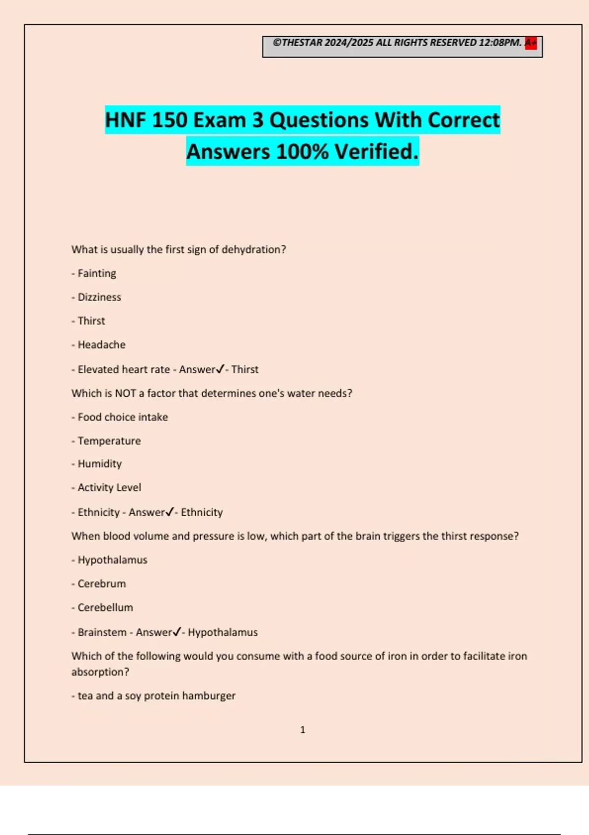 ©THESTAR 2024/2025 ALL RIGHTS RESERVED 12:08PM. A+ 1 HNF 150 Exam 3 Questions With Correct Answers 100% Verified. What is usually the first sign of dehydration? - Fainting - Dizziness - Thirst - Headache - Elevated heart rate - Answer- Thirst Which is NOT a factor that determines one's water needs? - Food choice intake - Temperature - Humidity - Activity Level - Ethnicity - Answer- Ethnicity When blood volume and pressure is low, which part of the brain triggers the thirst response? - Hypothalamus - Cerebrum - Cerebellum - Brainstem - Answer- Hypothalamus Which of the following would you consume with a food source of iron in order to facilitate iron absorption? - tea and a soy protein hamburger ©THESTAR 2024/2025 ALL RIGHTS RESERVED 12:08PM. A+ 2 - tomato and meat, fish or poultry - coffee and wheat bran muffins - calcium supplement and whole-wheat bread - Answer- tomato and meat, fish or poultry When trying to get adequate iron intake in your diet it is helpful to - eat non-heme iron found only in plants because it is absorbed more efficiently - consider adding supplements because they are better absorbed than iron in foods - combine vitamin C foods with non-heme iron to increase absorption - avoid combining heme-iron foods with non-heme-iron foods in the same meal - Answer- combine vitamin C foods with non-heme iron to increase absorption Jenny notices a discoloration in her teeth. What may be happening? She is showing signs of.. - dental caries from too much fluoride - goiters from too little fluoride - fluorosis from too little fluoride - fluorosis from too much fluoride - Answer- fluorosis from too much fluoride You are working with a child in a health clinic who has growth retardation, impaired immunity, and a poor appetite. This child is most likely experiencing - iron deficiency - chromium deficiency - zinc deficiency - phosphorus deficiency - Answer- zinc deficiency If a person has a deficient intake of calcium in the diet, what will be the result? - reduced absorption rate of calcium by the body - no change in levels of calcium in the blood because calcium will be pulled from the bones - gain of body weight - lowered levels of calcium in the blood because the calcium in bone cannot be withdrawn - Answer- no change in levels of calcium in the