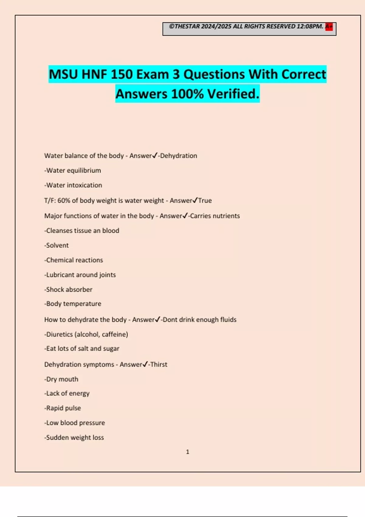 T/F: 60% of body weight is water weight - Answer✔True