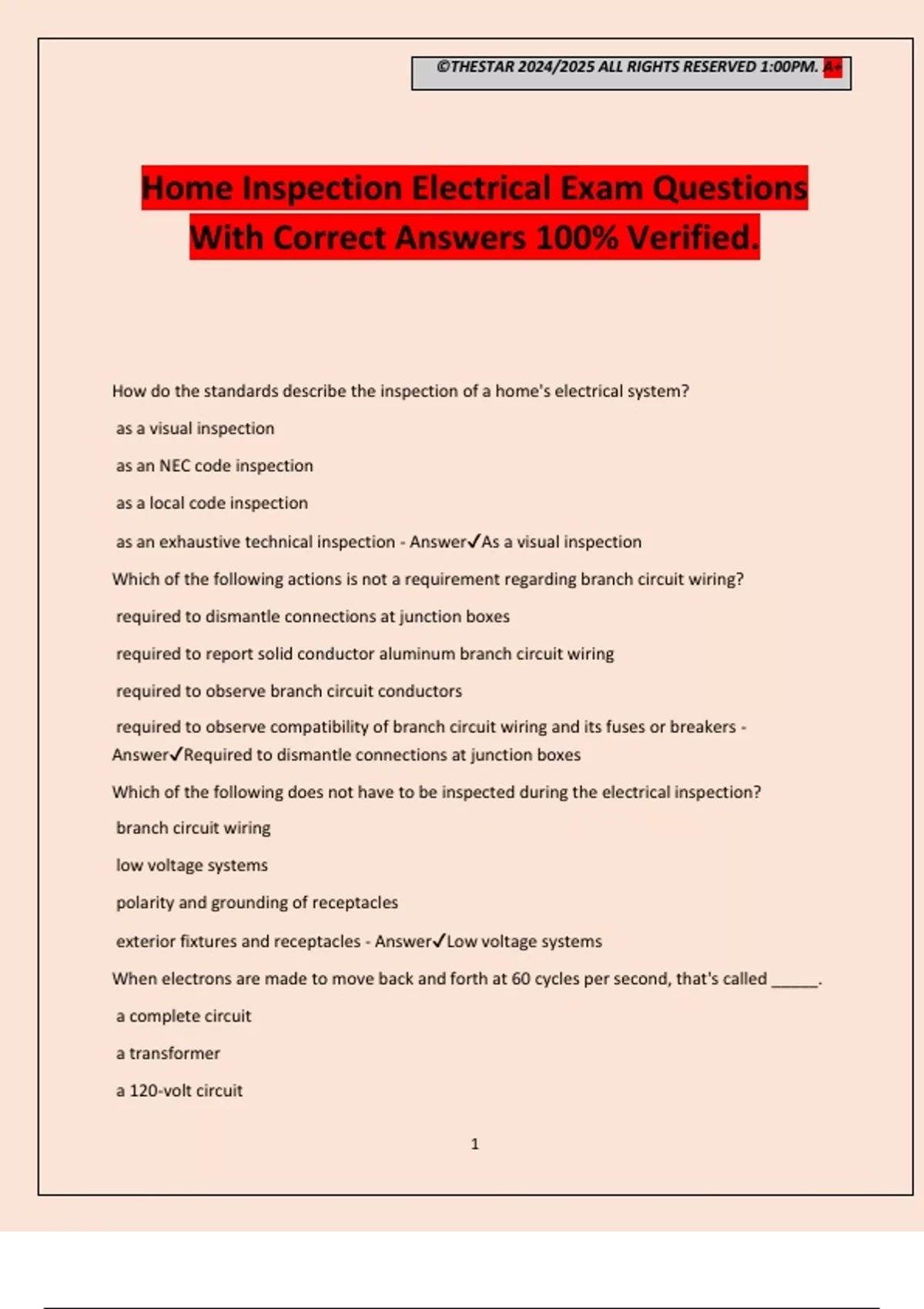 ©THESTAR 2024/2025 ALL RIGHTS RESERVED 1:00PM. A+ 1 Home Inspection Electrical Exam Questions With Correct Answers 100% Verified. How do the standards describe the inspection of a home's electrical system? as a visual inspection as an NEC code inspection as a local code inspection as an exhaustive technical inspection - AnswerAs a visual inspection Which of the following actions is not a requirement regarding branch circuit wiring? required to dismantle connections at junction boxes required to report solid conductor aluminum branch circuit wiring required to observe branch circuit conductors required to observe compatibility of branch circuit wiring and its fuses or breakers - AnswerRequired to dismantle connections at junction boxes Which of the following does not have to be inspected during the electrical inspection? branch circuit wiring low voltage systems polarity and grounding of receptacles exterior fixtures and receptacles - AnswerLow voltage systems When electrons are made to move back and forth at 60 cycles per second, that's called _____. a complete circuit a transformer a 120-volt circuit ©THESTAR 2024/2025 ALL RIGHTS RESERVED 1:00PM. A+ 2 an alternating current - AnswerAn alternating current Electricity moves along wires that are known as _____. resisters raceways insulators conductors - AnswerConductors Resistance to the flow of electricity is measured in _____. watts kilowatts ohms frequencies - AnswerOhms What is resistance? flow of electricity force that drives electrons in a current heat produced by the flow of electricity through a material opposition of a material to the flow of electricity - AnswerOpposition of a material to the flow of electricity A material with a high resistance would be a _____. good transformer good conductor good neutral wire good insulator - AnswerGood insulator The electrical pressure that pushes through th