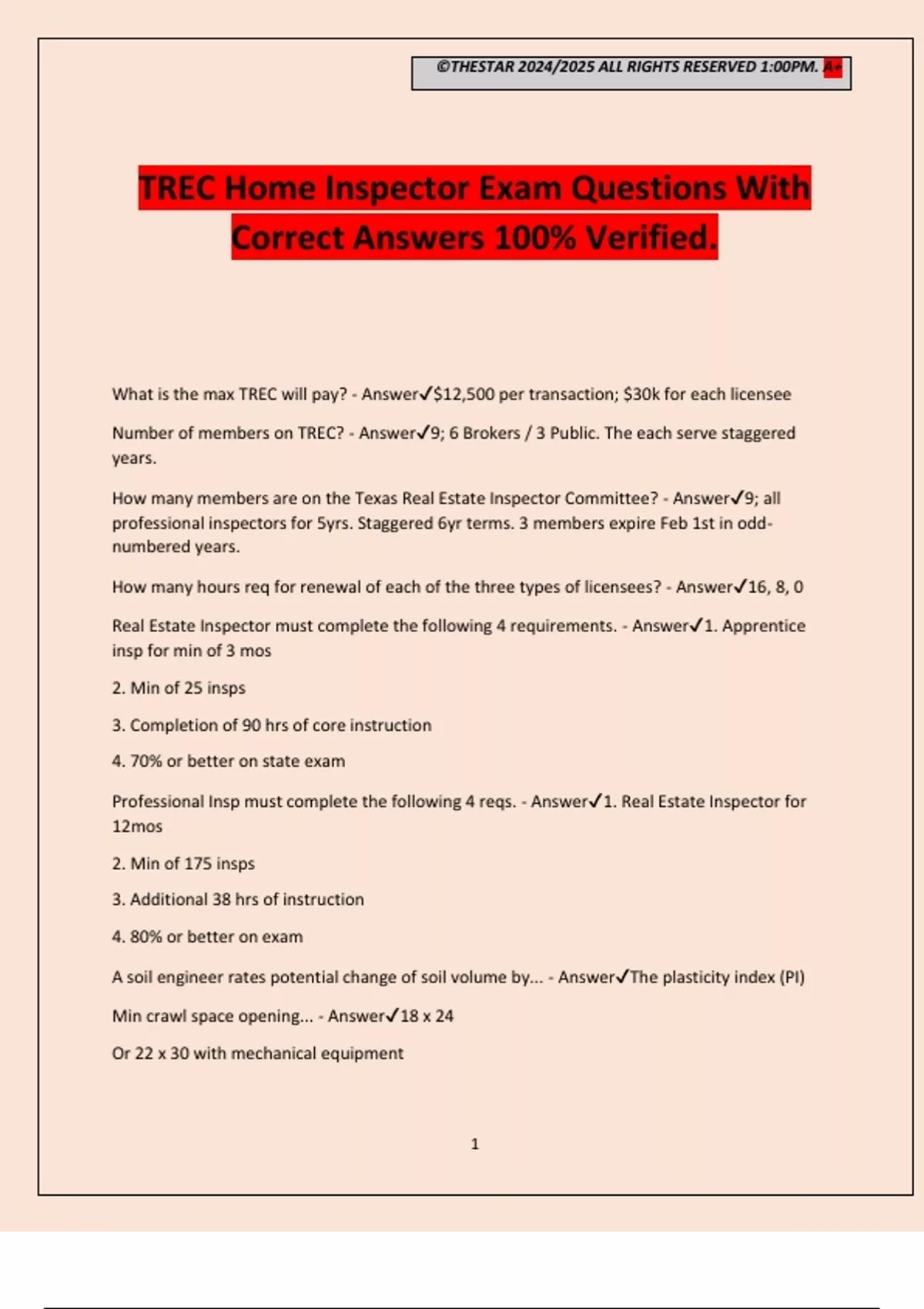 ©THESTAR 2024/2025 ALL RIGHTS RESERVED 1:00PM. A+ 1 TREC Home Inspector Exam Questions With Correct Answers 100% Verified. What is the max TREC will pay? - Answer$12,500 per transaction; $30k for each licensee Number of members on TREC? - Answer9; 6 Brokers / 3 Public. The each serve staggered years. How many members are on the Texas Real Estate Inspector Committee? - Answer9; all professional inspectors for 5yrs. Staggered 6yr terms. 3 members expire Feb 1st in odd- numbered years. How many hours req for renewal of each of the three types of licensees? - Answer16, 8, 0 Real Estate Inspector must complete the following 4 requirements. - Answer1. Apprentice insp for min of 3 mos 2. Min of 25 insps 3. Completion of 90 hrs of core instruction 4. 70% or better on state exam Professional Insp must complete the following 4 reqs. - Answer1. Real Estate Inspector for 12mos 2. Min of 175 insps 3. Additional 38 hrs of instruction 4. 80% or better on exam A soil engineer rates potential change of soil volume by.