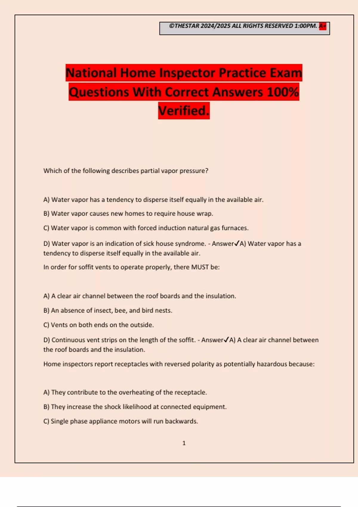 ©THESTAR 2024/2025 ALL RIGHTS RESERVED 1:00PM. A+ 1 National Home Inspector Practice Exam Questions With Correct Answers 100% Verified. Which of the following describes partial vapor pressure? A) Water vapor has a tendency to disperse itself equally in the available air. B) Water vapor causes new homes to require house wrap. C) Water vapor is common with forced induction natural gas furnaces. D) Water vapor is an indication of sick house syndrome. - AnswerA) Water vapor has a tendency to disperse itself equally in the available air. In order for soffit vents to operate properly, there MUST be: A) A clear air channel between the roof boards and the insulation. B) An absence of insect, bee, and bird nests. C) Vents on both ends on the outside. D) Continuous vent strips on the length of the soffit. - AnswerA) A clear air channel between the roof boards and the insulation. Home inspectors report receptacles with reversed polarity as potentially hazardous because: A) They contribute to the overheating of the receptacle. B) They increase the shock likelihood at connected equipment. C) Single phase appliance motors will run backwards. ©THESTAR 2024/2025 ALL RIGHTS RESERVED 1:00PM. A+ 2 D) They trip ground fault circuit interrupter outlets. - AnswerB) They increase the shock likelihood at connected equipment. The term "wet vent" refers to a: A) Vent that traps water and therefore stays wet. B) Vent located above the roof line and exposed to rain. C) Vent that runs outside an exterior wall. D) Waste line that also functions as a vent. - AnswerD) Waste line that also functions as a vent. EIFS is a siding material that: A) Is used in commercial buildings only. B) Looks like stucco but lacks a wire mesh. C) Can be installed on top of a modified bitumen membrane. D) Can be installed on top of a masonry surface. - AnswerB) Looks like stucco but lacks a wire mesh. The joints on the exterior of the brick chimney should be: A) Concaved. B) Raked. C) Open. D) Closed. - AnswerA) Concaved When a water heater thermostat is set at 140 ° F or higher, a ______ should be installed to temper the water. A) Temperature pro