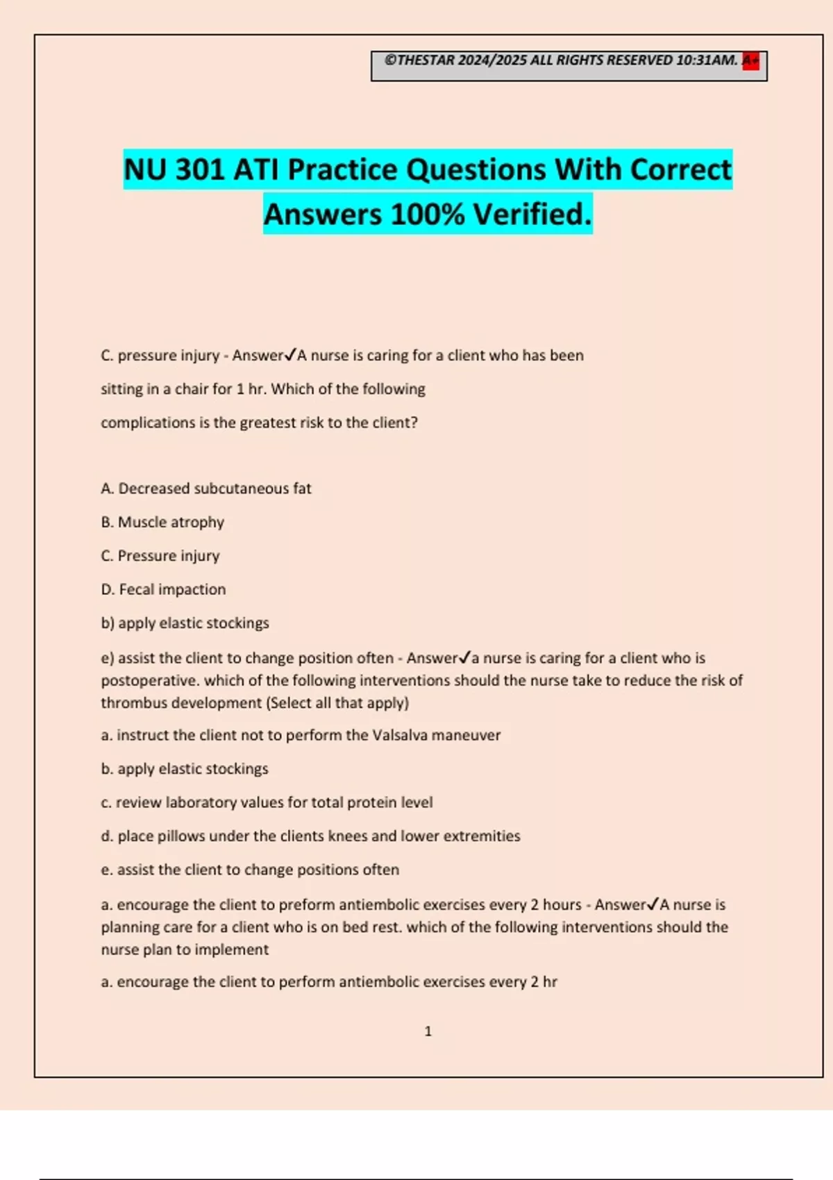 e) assist the client to change position often - Answer✔a nurse is caring for a client who is