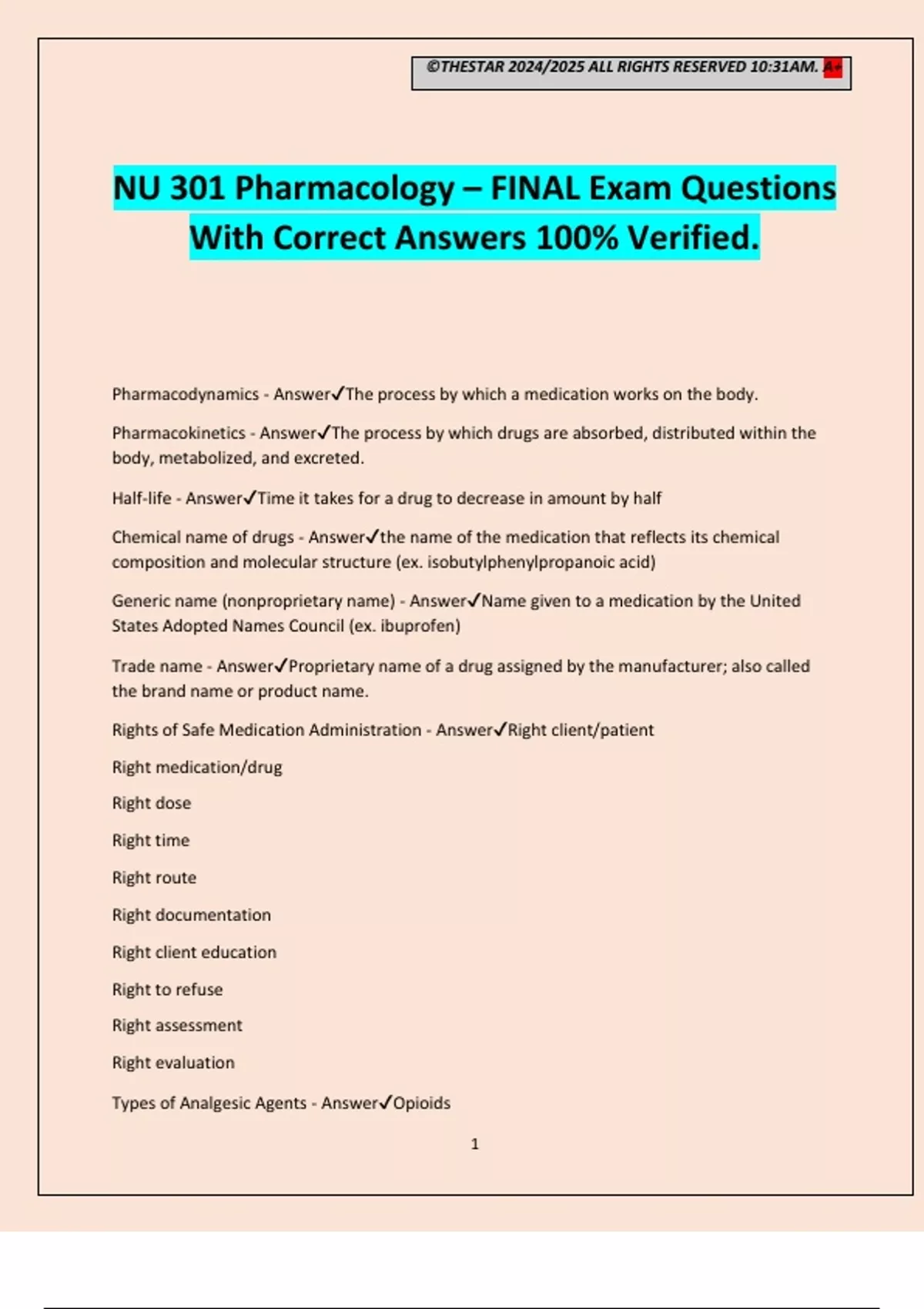 ©THESTAR 2024/2025 ALL RIGHTS RESERVED 10:31AM. A+ 1 NUR301 FINAL EXAM PRACTICE Questions With Correct Answers 100% Verified. The nurse understands which is the cause of respiratory alkalosis? A. hyperglycemia b. hyperventilation c. fluid loss d. airway compromise - Answerb. hyperventilation the nurse instructs a pt how to use an incentive spirometer. which statement by the pt shows that teaching is effective? a. i should take a deep breathe and blow into the mouthpiece b. im glad i only have to do this twice a day c. i can ask for pain medication prior to using the spirometer d. i should lie down to use the spirometer - Answerc. i can ask for pain medication prior to using the spirometer rationale: the pt will put the mouthpiece in the mouth and close the lips tightly around it. the pt will slowly exhale completely. the pt will then inhale slowly and deeply to make the piston rise the nurse identifies which client is most at risk for developing pneumonia? a. a client with a urinary catheter b. a client with an ng tube c. a client with psoriasis d. a client with paget disease - Answerb. a client with an ng tube when assessing a client for tactile remitUs, which part of the hand does the nurse use? ©THESTAR 2024/2025 ALL RIGHTS RESERVED 10:31AM. A+ 2 a. fingertips and finger pads b. dorsal surface of the hand c. ulnar and palmar surface of the hand d. dorsiflexed surface of the wrist - Answerc. ulnar and palmar surface of the hand rationale: the nurse asks the pt to say the number "99". tactile remits is palpable vibrations that will increase when lung consolidation exists such as with pneumonia, and decreased with pleural effusion, pneumothorax, bronchial obstruction or air trapping occurs a pt is admitted into the hospital with a diagnosis of acute right upper lobe pneumonia. the pt has a history of chronic bronchitis. which symptom does the nurse expect to see? a. moist, cool skin b. rust-colored sputum c. bradycardia d. decreased respiratory rate - Answerb. rust-colored sputum rationale: rust colored sputum, or blood-tinged due to inflammation is a typical finding for pneumonia. the pt may also have increased respirations, dyspnea, coughing, and pleuritic pain. treatment includes antibiotics, supplemental oxygen, and chest pt. the nurse should assess breath sounds, VS including pulse oximetry. the nurse should encourage coughing and deep breathing every 2 hours and increased fluids the nurse places a pulse oximetry probe on a pt. the pt asks "why do i have this thing on me?" which response by the nurse is the best? a. it enables your IV fluids to run b. it monitors your pulse rate c it tells us if your BP is within normal limits d it measures the amount of oxygen circulating in your blood - Answerd it measures the amount of oxygen circulating in your blood on the first post day, a pt developed a fever. the nurse auscultates crackles bilaterally in the lower lobes. the nurse understands which complication of surgery is probably developing? a. HF b. thromophlebitis ©THESTAR 2024/2025 ALL RIGHTS RESERVED 10:31AM. A+ 3 c. PE d. atelectasis - Answerd. atelectasis rationale: general anesthesia is a common cause of atelectasis. atelectasis occurs when secretions block the bronchioles and the alveoli collapse, causing hypoventilation. deep breathing excercies and coughing after surgery can reduce the pt's risk of developing this the nurse monitors a client receiving oxygen per face mask. the nurse is most concerned with which observation a. there is condensation in the tubing b. the pulse oximetry reading is 92% c. the client has a nonproductive cough d. the skin under the elastic band is reddened - Answerc. the client has a nonproductive cough rationale: this is a sign of lung oxygen toxicity which objective data is most important when determining if a pt is hypoxic? a. cool, bluish skin b. abnormal blood gases c. elevated temperature d. increased sputum production - Answerb. abnormal blood gases rationale: arterial blood gases (ABG) measures tissue oxygenation, co2 removal, and acid-base balance. if the pt has inadequate exchange of oxygen and co2, respiratory acidosis occurs the nurse identifies which type of food is most likely to present problems for a pt with respiratory issues? a fruits b grains c dairy d fish - Answerc dairy ©THESTAR 2024/2025 ALL RIGHTS RESERVED 10:31AM. A+ 4 rationale: dairy products are mucus producing which can cause thick secretions after receiving hand off shift report, the nurse assesses a pt who is having cheyne-stokes respirations. which is the best description of this breathing pattern? a. regular but increased in rate and abnormally deep respirations b. irregular patterns of shallow breathing alternating with periods of apnea c. regular rapid and shallow breathing d. gradual increase in depth of respirations, followed by a gradual decrease in depth, then a period of apnea - Answerd. gradual increase in depth of respirations, followed by a gradual decrease in depth, then a period of apnea after oxygen had been administered, the next priority intervention the nurse would initiate for a pt with a pulmonary embolism is the administration of which of the following therapies? a. normal saline IV fluid b. IV heparin c. platelet administration d. antibiotics for inflammatory fever - Answerb. IV heparin a pt diagnosed with pneumonia complains of a new onset slight SOB. for which of the following assessment findings would the nurse call the doctor immediately? (select all that apply a. the pt is voiding, but amounts are decreasing b. the pt is sleeping more than usual c. there is pink coloration to the skin d. the pt's secretions are thin and milky colored e. the pt thought it was the 3rd instead of the 5