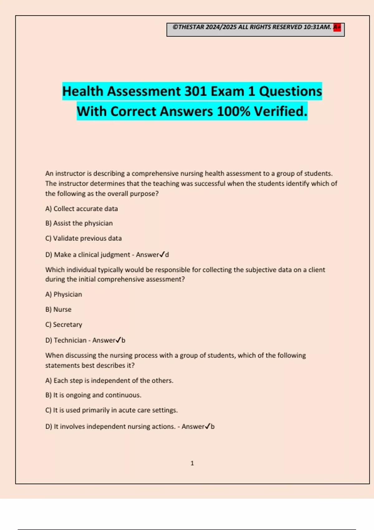 Health Assessment 301 Exam 1 Questions
