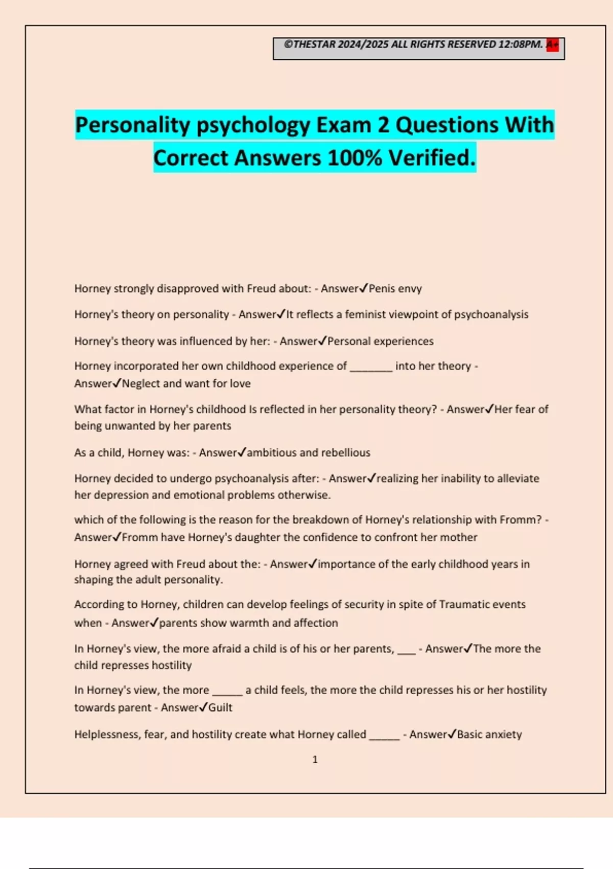 ©THESTAR 2024/2025 ALL RIGHTS RESERVED 12:08PM. A+ 1 Personality psychology Exam 2 Questions With Correct Answers 100% Verified. Horney strongly disapproved with Freud about: - AnswerPenis envy Horney's theory on personality - AnswerIt reflects a feminist viewpoint of psychoanalysis Horney's theory was influenced by her: - AnswerPersonal experiences Horney incorporated her own childhood experience of _______ into her theory - AnswerNeglect and want for love What factor in Horney's childhood Is reflected in her personality theory? - AnswerHer fear of being unwanted by her parents As a child, Horney was: - Answerambitious and rebellious Horney decided to undergo psychoanalysis after: - Answerrealizing her inability to alleviate her depression and emotional problems otherwise. which of the following is the reason for the breakdown of Horney's relationship with Fromm? - AnswerFromm have Horney's daughter the confidence to confront her mother Horney agreed with Freud about the: - Answerimportance of the early childhood years in shaping the adult personality. According to Horney, children can develop feelings of security in spite of Traumatic events when - Answerparents show warmth and affection In Horney's view, the more afraid a child is of his or her parents, ___ - AnswerThe more the child represses hostility In Horney's view, the more _____ a child feels, the more the child represses his or her hostility towards parent - AnswerGuilt Helplessness, fear, and hostility create what Horney cal