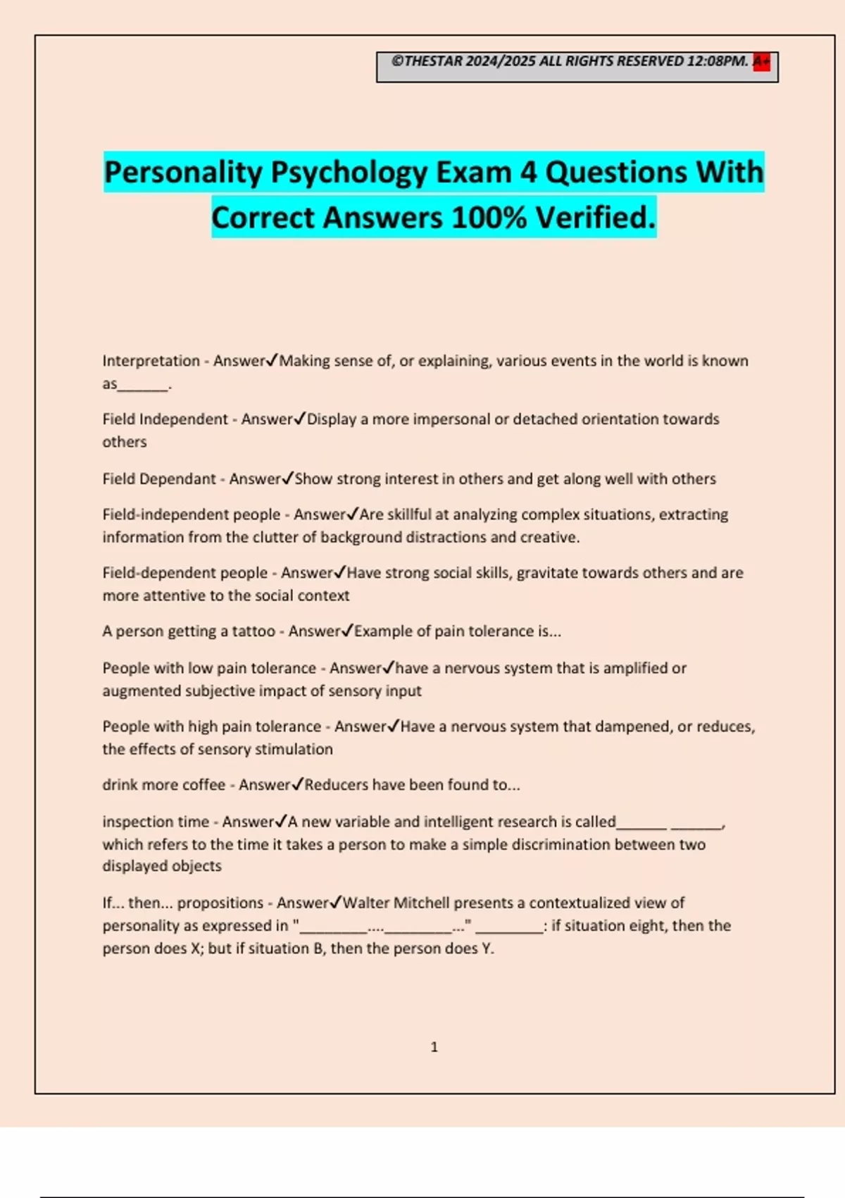 ©THESTAR 2024/2025 ALL RIGHTS RESERVED 12:08PM. A+ 1 Personality Psychology Exam 4 Questions With Correct Answers 100% Verified. Interpretation - AnswerMaking sense of, or explaining, various events in the world is known as______. Field Independent - AnswerDisplay a more impersonal or detached orientation towards others Field Dependant - AnswerShow strong interest in others and get along well with others Field-independent people - AnswerAre skillful at analyzing complex situations, extracting information from the clutter of background distractions and creative. Field-dependent people - AnswerHave strong social skills, gravitate towards others and are more attentive to the social context A person getting a tattoo - AnswerExample of pain tolerance is... People with low pain tolerance - Answerhave a nervous system that is amplified or augmented subjective impact of sensory input People with high pain tolerance - AnswerHave a nervous system that dampened, or reduces, the effects of sensory stimulation drink more coffee - AnswerReducers have been found to... inspection time - AnswerA new variable and intelligent research is called______ ______, which refers to the time it takes a person to make a simple discrimination between two displayed objects If... then... propositions - AnswerWalter Mitchell presents a contextualized view of personality as expressed in "________....________..." ________: if situation eight, then the person does X; but if situation B, then the person does Y. ©THESTAR 2024/2025 ALL RIGHTS RESERVED 12:08PM. A+ 2 multiple intelligences - AnswerBased on his definition of intelligence, Howard Gardner proposed a theory of______space______, which includes seven forms, such as interpersonal intelligence, intrapersonal intelligence, kinesthetic intelligence, and musical intelligence. How people think about themselves relative to their goal - AnswerThe cognitive social learning approach has expanded on the notion that personality is expressed in ________. Personal project - AnswerA______ ______ is a set of relevant actions intended to achieve a goal that a person has selected Cognitive - AnswerDifferences in how people think are the focus of______approaches to personality. entity theory - Answerperson's level of intelligence is fixed and unchangeable characteristic incremental theory - AnswerPeople believe that their intelligence can be increased through effort and persistence achievement view of intelligence - AnswerAssociate with educational attainment aptitude view of intelligence - AnswerAssociated with the ability to become educated explanatory style - AnswerTo refer to tendencies some people have to frequently use certain reasons for the causes of events, psychologist use the term______. field dependent - AnswerRely on cues from the environment surrounding the object field independent - AnswerRely on their own sensations to make a judgment Interpreting the social world - AnswerAccording to George Kelly, people have a few key constructs that they habitually reply in______. Summarizes and conveys the meaning of a set of observations - AnswerA construct is a word that... Personal construct serve to create a persons psychological reality - AnswerGeorge Kelly's theory is considered postmodern due to its emphasis on how... fundamental postulate - AnswerGeorge Kelly's most basic idea with regard to his complex and systematic theory of personality was the... anxiety - AnswerAccording to George Kelly,_____ is the result of not being able to understand and protect life events. Locus of control - Answer_________ is a concept that describes a person's perception of responsibility for the events in his or