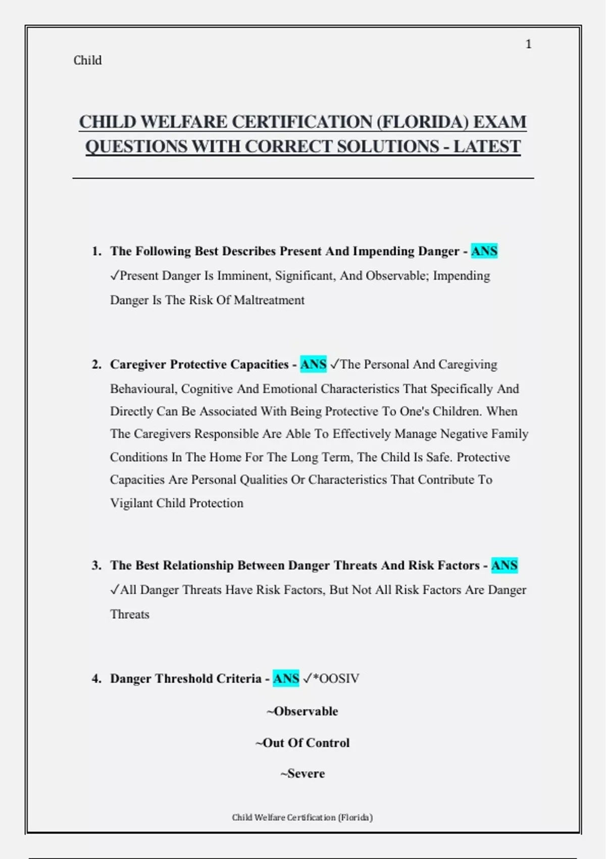 CHILD WELFARE CERTIFICATION (FLORIDA) EXAM QUESTIONS WITH CORRECT SOLUTIONS - LATEST