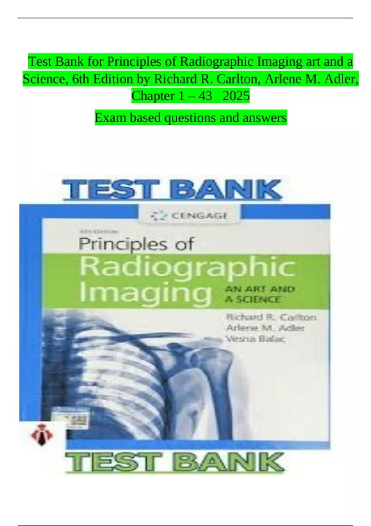 Test Bank for Principles of Radiographic Imaging art and Science, 6th Edition by Richard R. Carlton, Arlene M. Adler, Chapter 1 – 43 2025 Exam based questions and answers The relationship between the radiation exposure and optical density for any specific film depends on: a. the shape of the densitometric curve b. the position of the sensitometric curve c. the slope of the sensitometric curve d. all of the above ANS. all of the above Geometric properties of the image determine: a. how accurately anatomic details are recorded b. the level of sharpness in the image c. the visibility of the anatomy d. A and B ANS.A and B (how accurately anatomic details are recorded & the level of sharpness in the image) To measure resolution, a _______ is necessary: a. sensitometer b. densitometer c. resolution test pattern d. resolution camera ANS.resolution test pattern The maximum resolution the human eye is able to see is approximately: a. 2 Lp/mm b. 5 Lp/mm c. 8 Lp/mm d. 10 Lp/mm ANS.5 Lp/mm The spatial resolution of film-screen imaging systems is: a. excellent b. poor c. horrible--that's why we now use digital imaging d. none of the above ANS. excellent Size distortion is also called: a. elongation b. magnification c. shape distortion d. foreshortening ANS. magnification When the image of a structure appears longer than the actual structure, there is: a. size distortion b. foreshortening c. magnification d. elongation ANS .elongation Shape distortion is caused by: a. increasing the OID b. angling the x-ray tube c. angling the patient d. B & C ANS.B & C (Angling the x-ray tube & angling the patient) The range of exposure intensities an image receptor can detect is: a. density b. contrast c. speed d. dynamic range ANS. dynamic range