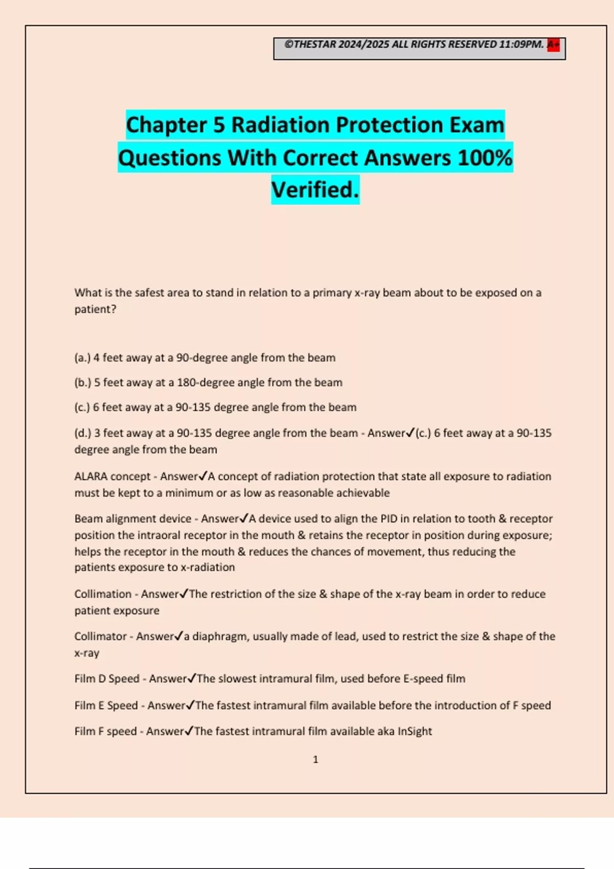Filtration, total - Answer✔The combination of the inherent filtration & added filtration in an x-