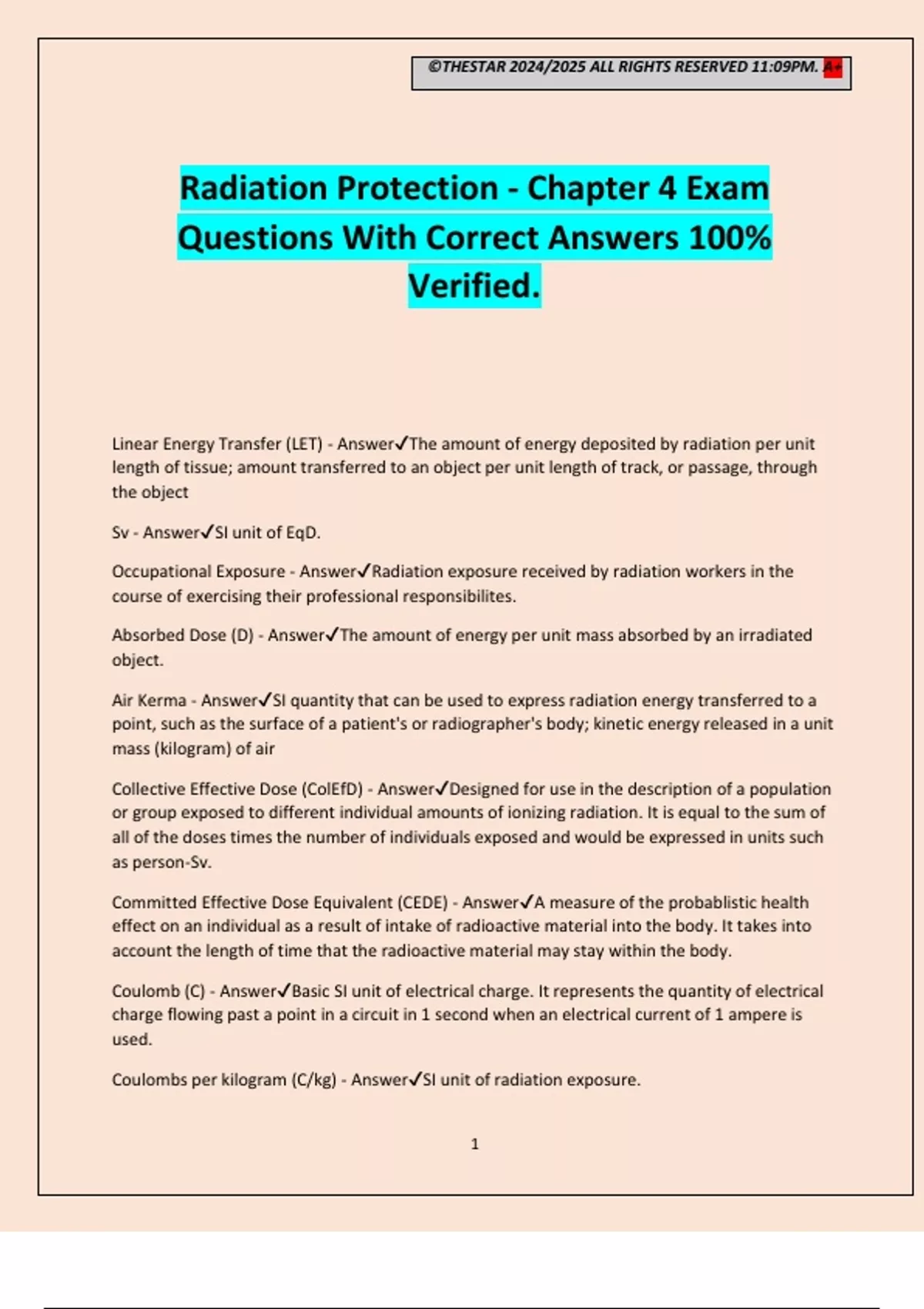 Linear Energy Transfer (LET) - Answer✔The amount of energy deposited by radiation per unit