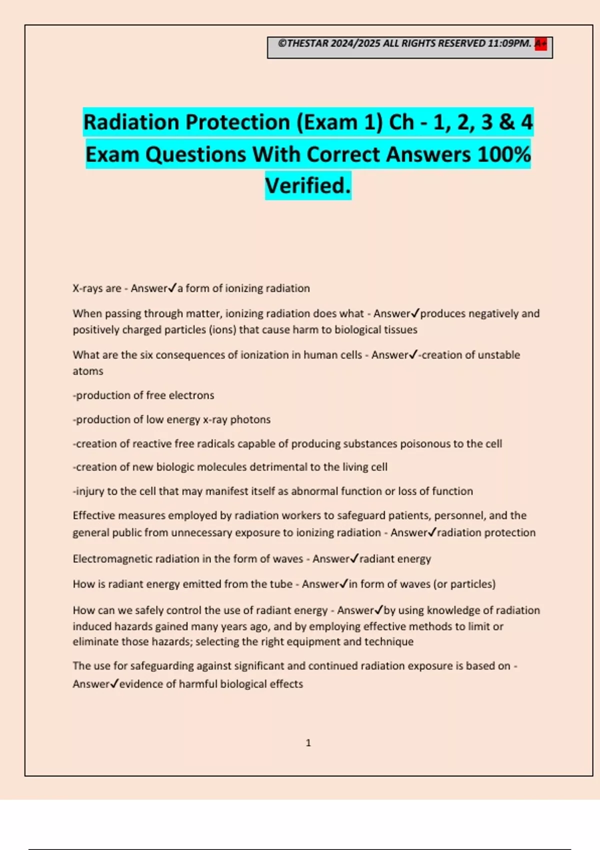 ©THESTAR 2024/2025 ALL RIGHTS RESERVED 11:09PM. A+ 1 Radiation Protection (Exam 1) Ch - 1, 2, 3 & 4 Exam Questions With Correct Answers 100% Verified. X-rays are - Answera form of ionizing radiation When passing through matter, ionizing radiation does what - Answerproduces negatively and positively charged particles (ions) that cause harm to biological tissues What are the six consequences of ionization in human cells - Answer-creation of unstable atoms -production of free electrons -production of low energy x-ray photons -creation of reactive free radicals capable of producing substances poisonous to the cell -creation of new biologic molecules detrimental to the living cell -injury to the cell that may manifest itself as abnormal function or loss of function Effective measures employed by radiation workers to safeguard patients, personnel, and the general public from unnecessary exposure to ionizing radiation - Answerradiation protection Electromagnetic radiation in the form of waves - Answerradiant energy How is radiant energy emitted from the tube - Answerin form of waves (or particles) How can we safely control the use of radiant energy - Answerby using knowledge of radiation induced hazards gained many years ago, and by employing effective methods to limit or eliminate those hazards; selecting the right equipment and technique The use for safeguarding against significant and continued radiation exposure is based on - Answerevidence of harmful biological effects ©THESTAR 2024/2025 ALL RIGHTS RESERVED 11:09PM. A+ 2 Any radiation exposure that does not benefit a person in terms of diagnostic information obtained for the clinical management of medical needs or any radiation exposure that does not enhance the quality of the study - Answerunnecessary exposure to ionizing radiation Degree to which a diagnostic study reveals the presence or absence of disease in the patient - AnswerDiagnostic efficacy Risk (in general terms) - Answerthe probability of injury, ailment, or death resulting from an activity Risk (in the medical industry) - Answerthe possibility of inducing a radiogenic cancer or genetic defect after irradiation BERT (Background Equivalent Radiation Time) - Answer-method used to reduce patient fears and anxiety -compares the amount of radiation received with natural background radiation received over a given period of time Electromagnetic waves are characterized by - Answerfrequency and wavelength What are forms of ionizing radiation - Answerx-rays, gamma rays, and high energy ultraviolet radiation Chest - Answer10 days (BERT value) C Spine - Answer2 wk (BERT value) T Spine - Answer6 mo (BERT value) L Spine - Answer1 yr (BERT value) Upper GI Series - Answer1.5 yr (BERT value) Lower GI Series - Answer2 yr (BERT value) Skull - Answer11 day (BERT value) Hip - Answer7 wk (BERT value) Pelvis - Answer4 mo (BERT value) Abdomen - Answer4 mo (BERT value) Limbs and joints (except hip) - Answer<1.5 days (BERT value) CT Brain - Answer1 yr (B