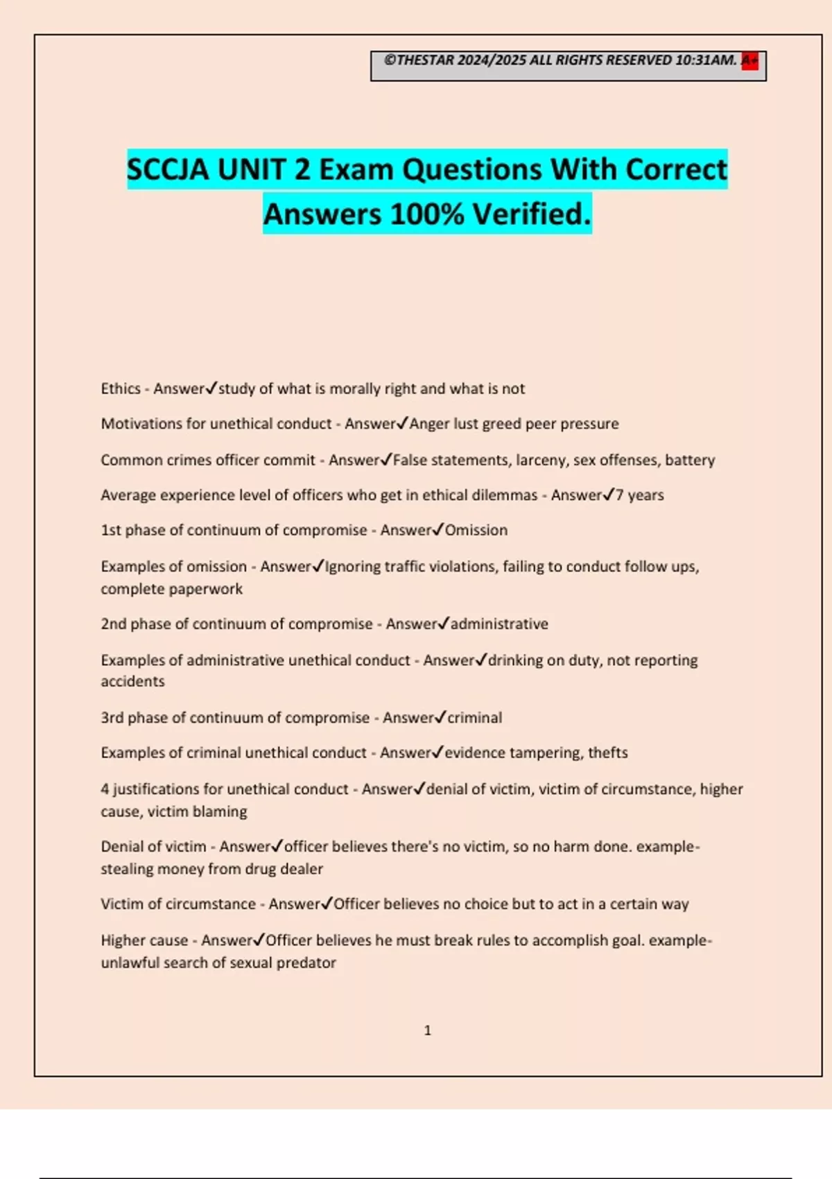 ©THESTAR 2024/2025 ALL RIGHTS RESERVED 10:31AM. A+ 1 SCCJA UNIT 2 Exam Questions With Correct Answers 100% Verified. Ethics - Answerstudy of what is morally right and what is not Motivations for unethical conduct - AnswerAnger lust greed peer pressure Common crimes officer commit - AnswerFalse statements, larceny, sex offenses, battery Average experience level of officers who get in ethical dilemmas - Answer7 years 1st phase of continuum of compromise - AnswerOmission Examples of omission - AnswerIgnoring traffic violations, failing to conduct follow ups, complete paperwork 2nd phase of continuum of compromise - Answeradministrative Examples of administrative unethical conduct - Answerdrinking on duty, not reporting accidents 3rd phase of continuum of compromise - Answercriminal Examples of criminal unethical conduct - Answerevidence tampering, thefts 4 justifications for unethical conduct - Answerdenial of victim, victim of circumstance, higher cause, victim blaming Denial of victim - Answerofficer believes there's no victim, so no harm done. example- stealing money from drug dealer Victim of circumstance - AnswerOfficer believes no choice but to act in a certain way Higher cause - AnswerOfficer believes he must break rules to accomplish goal. example- unlawful search of sexual predator ©THESTAR 2024/2025 ALL RIGHTS RESERVED 10:31AM. A+ 2 Consequences of unethical conduct - AnswerCriminal charges, civil litigation, negative impact on community relations, disciplinary action, loss of certification, domestic problems Greatest consequence of unethical conduct - Answerofficer safety 2 groups that officers feel pressured by to keep quiet about unethical conduct - AnswerIndividuals who commit the act, someone not involved in it 4 consequences officers believe will happen if they don't uphold code of silence - AnswerOfficer involved will be disciplined, officer who ratted will be disciplined, officer who ratted will be shunned, administration won't do anything Ways agencies can control code of silence - Answerethics training, accountability, open communication, anon reporting, protect officers who come forward 2 ways social media affects law enforcement - Answeragency's image and officer's credibility 8 reasons academy can deny certification - Answerconviction of a felony or crime with sentence of more than 1 year, illegal use of controlled substance, excessive force, unsafe firearm or vehicle usage, abuse of public, falsification of employment info, lying to employer, untruthfulness to employer 4 reasons certification can be revoked - AnswerFalsification of certification application, officer found ineligible for service due to failure to meet prereqs, officer convicted of criminal offense, misconduct Moral turpitude - AnswerAnything done contrary to justice, honesty, modesty or good morals. Crimes of moral turpitude - Answerfraud larceny intent to harm persons or things Statutory law - Answerenacted by legislature Common law - Answerdeveloped in England from customs and court decisions, adopted by SC in 1712 How many felony categories? - Answer6 How many felonies exempt from classification system? And what kind? - Answer40- Murder, Homicide by Child Abuse, Burglary 1st, drug trafficking How many misdemeanor categories? - Answer3 What misdemeanors are exempt from classification? - AnswerThose that carry term of less than 1 year or more than 3 Class A Misdemeanor - Answe