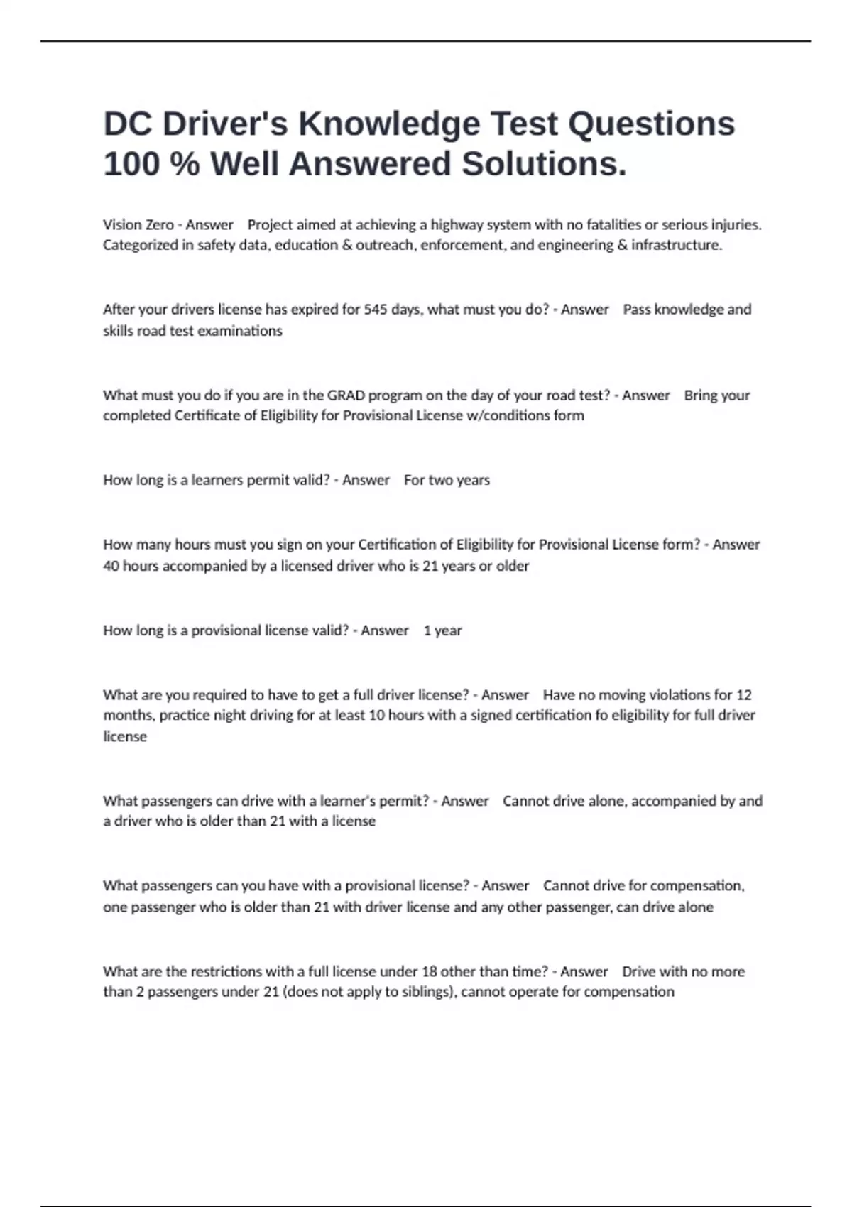 Vision Zero - Answer Project aimed at achieving a highway system with no fatalities or serious injuries. Categorized in safety data, education & outreach, enforcement, and engineering & infrastructure. After your drivers license has expired for 545 days, what must you do? - Answer Pass knowledge and skills road test examinations What must you do if you are in the GRAD program on the day of your road test? - Answer Bring your completed Certificate of Eligibility for Provisional License w/conditions form How long is a learners permit valid? - Answer For two years How many hours must you sign on your Certification of Eligibility for Provisional License form? - Answer 40 hours accompanied by a licensed driver who is 21 years or older How long is a provisional license valid? - Answer 1 year What are you required to have to get a full driver license? - Answer Have no moving violations for 12 months, practice night driving for at least 10 hours with a signed certification fo eligibility for full driver license What passengers can drive with a learner's permit? - Answer Cannot drive alone, accompanied by and a driver who is older than 21 with a license What passengers can you have with a provisional license? - Answer Cannot drive for compensation, one passenger who is older than 21 with driver license and any other passenger, can drive alone What are the restrictions with a full license under 18 other than time? - Answer Drive with no more than 2 passengers under 21 (does not apply to siblings), cannot operate for compensation
