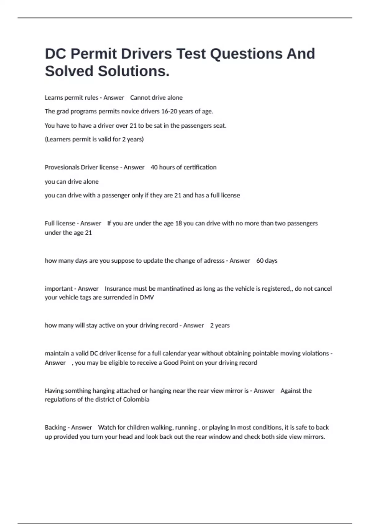 DC Permit Drivers Test Questions And Solved Solutions.