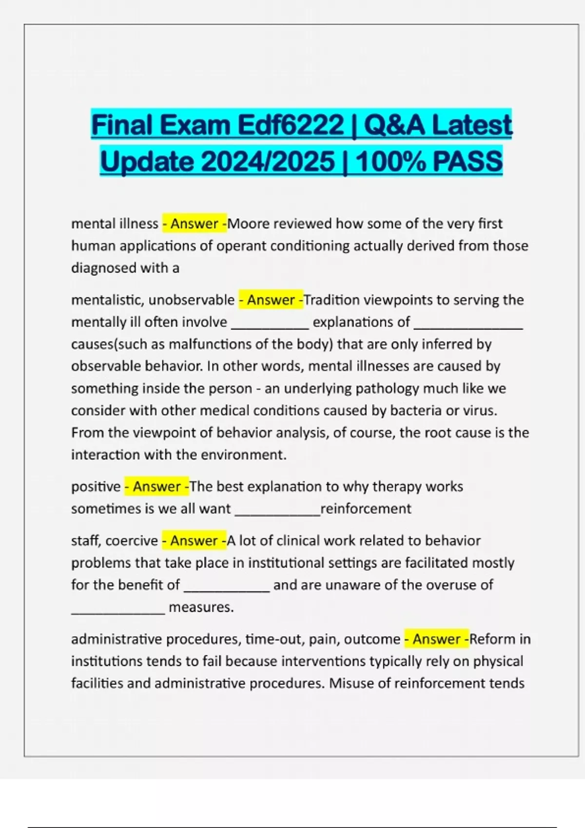 Final Exam Edf6222 | Q&A Latest Update 2024/2025 | 100% PASS mental illness - Answer -Moore reviewed how some of the very first human applications of operant conditioning actually derived from those diagnosed with a mentalistic, unobservable - Answer -Tradition viewpoints to serving the mentally ill often involve __________ explanations of ______________ causes(such as malfunctions of the body) that are only inferred by observable behavior. In other words, mental illnesses are caused by something inside the person - an underlying pathology much like we consider with other medical conditions caused by bacteria or virus. From the viewpoint of behavior analysis, of course, the root cause is the interaction with the environment. positive - Answer -The best explanation to why therapy works sometimes is we all want ___________reinforcement staff, coercive - Answer -A lot of clinical work related to behavior problems that take place in institutional settings are facilitated mostly for the benefit of ___________ and