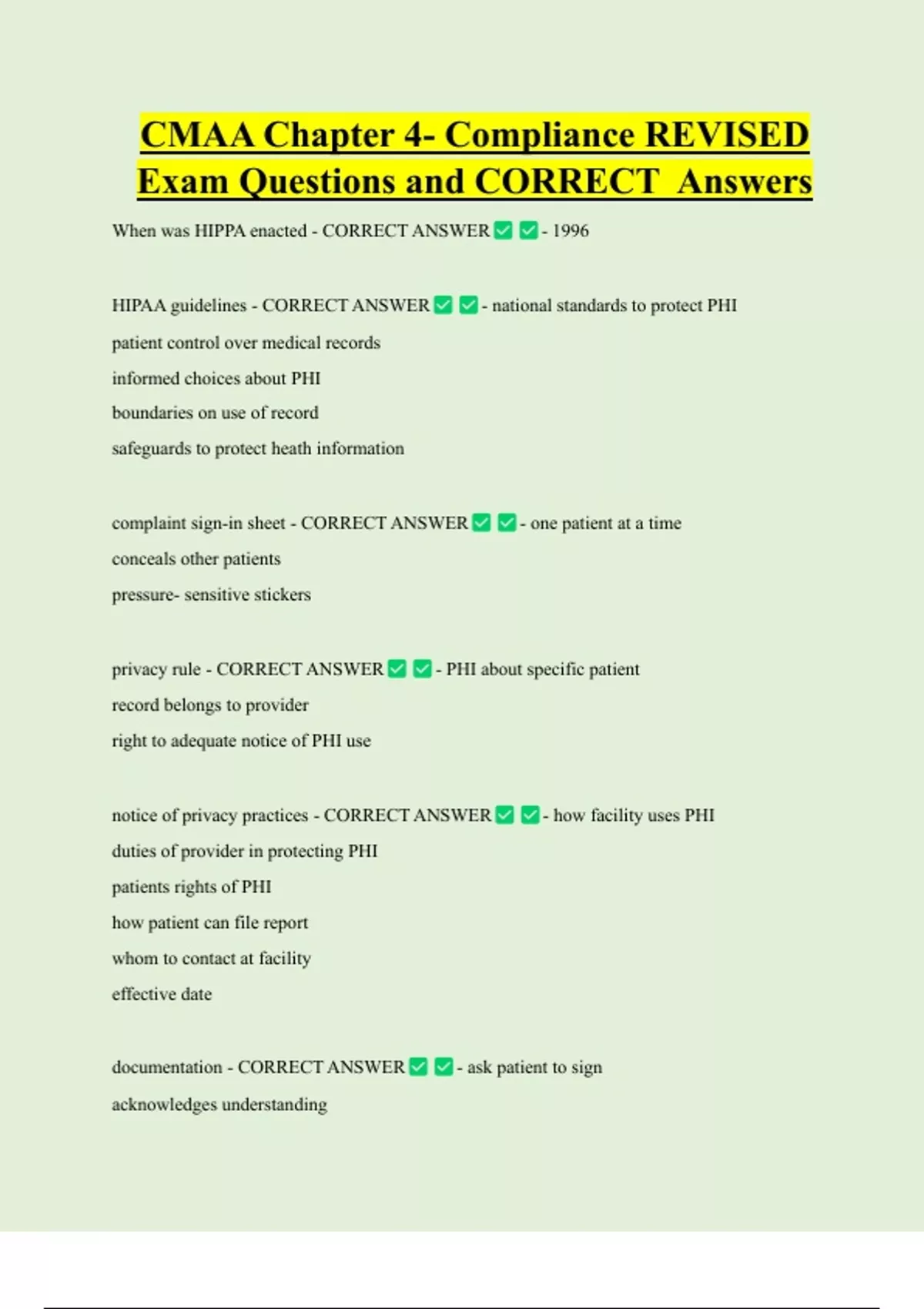 CMAA Chapter 4- Compliance REVISED Exam Questions and CORRECT Answers When was HIPPA enacted - CORRECT ANSWER - 1996 HIPAA guidelines - CORRECT ANSWER - national standards to protect PHI patient control over medical records informed choices about PHI boundaries on use of record safeguards to protect heath informati