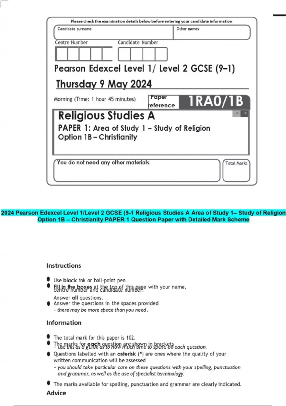 2024 Pearson Edexcel Level 1/Level 2 GCSE (9-1 Religious Studies A Area of Study 1– Study of Religion Option 1B – Christianity PAPER 1 Question Paper with Detailed Mark Scheme