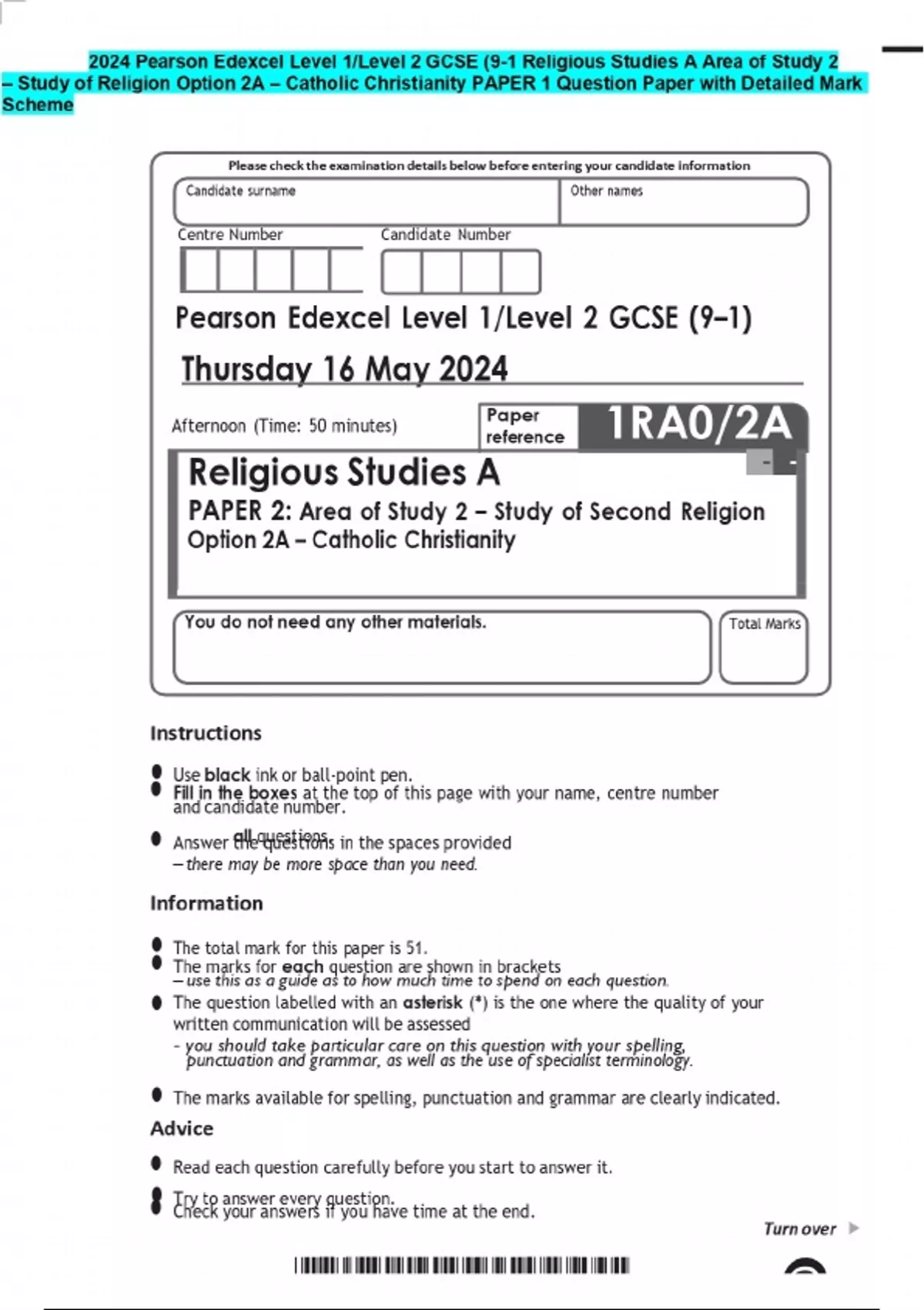 2024 Pearson Edexcel Level 1/Level 2 GCSE (9-1 Religious Studies A Area of Study 2 – Study of Religion Option 2A – Catholic Christianity PAPER 1 Question Paper with Detailed Mark Scheme
