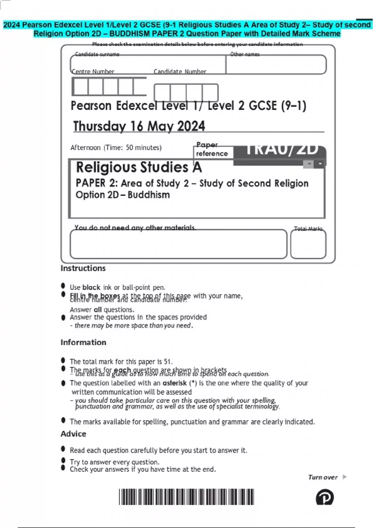 2024 Pearson Edexcel Level 1/Level 2 GCSE (9-1 Religious Studies A Area of Study 2– Study of second Religion Option 2D – BUDDHISM PAPER 2 Question Paper with Detailed Mark Scheme