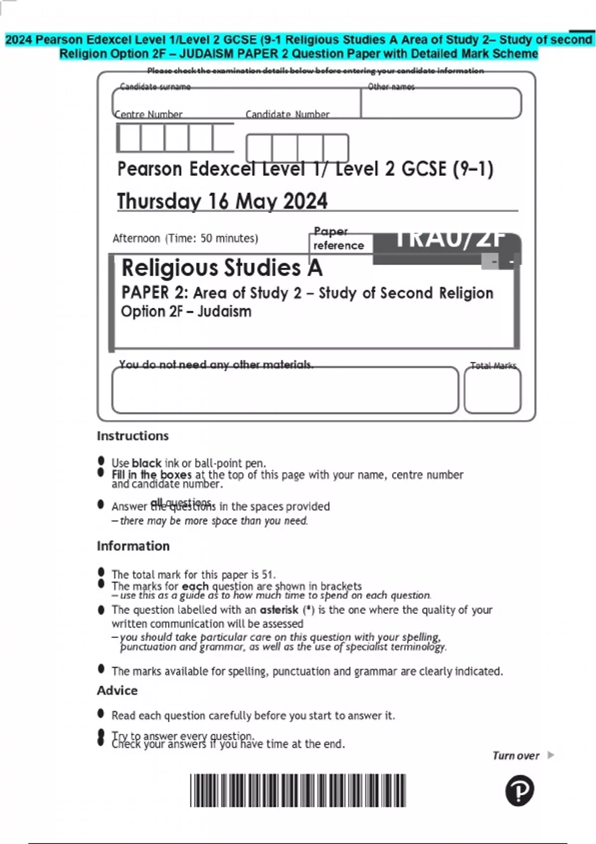 2024 Pearson Edexcel Level 1/Level 2 GCSE (9-1 Religious Studies A Area of Study 2– Study of second Religion Option 2F – JUDAISM PAPER 2 Question Paper with Detailed Mark Scheme