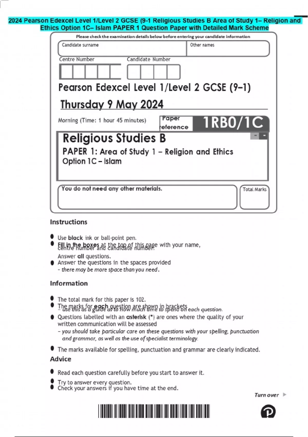 2024 Pearson Edexcel Level 1/Level 2 GCSE (9-1 Religious Studies B Area of Study 1– Religion and Ethics Option 1C– Islam PAPER 1 Question Paper with Detailed Mark Scheme