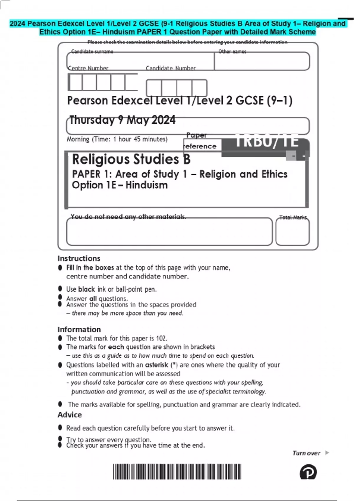 2024 Pearson Edexcel Level 1/Level 2 GCSE (9-1 Religious Studies B Area of Study 1– Religion and Ethics Option 1E– Hinduism PAPER 1 Question Paper with Detailed Mark Scheme