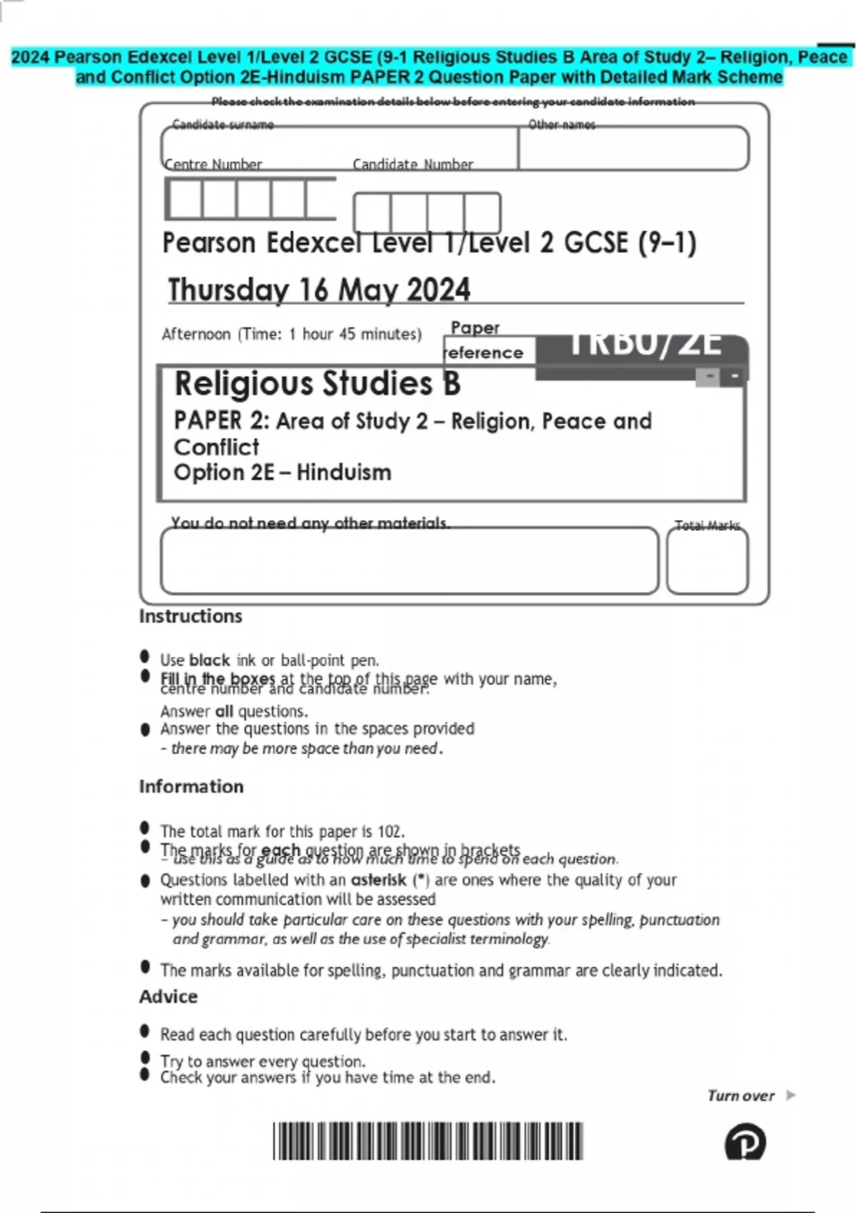 2024 Pearson Edexcel Level 1/Level 2 GCSE (9-1 Religious Studies B Area of Study 2– Religion, Peace and Conflict Option 2E-Hinduism PAPER 2 Question Paper with Detailed Mark Scheme
