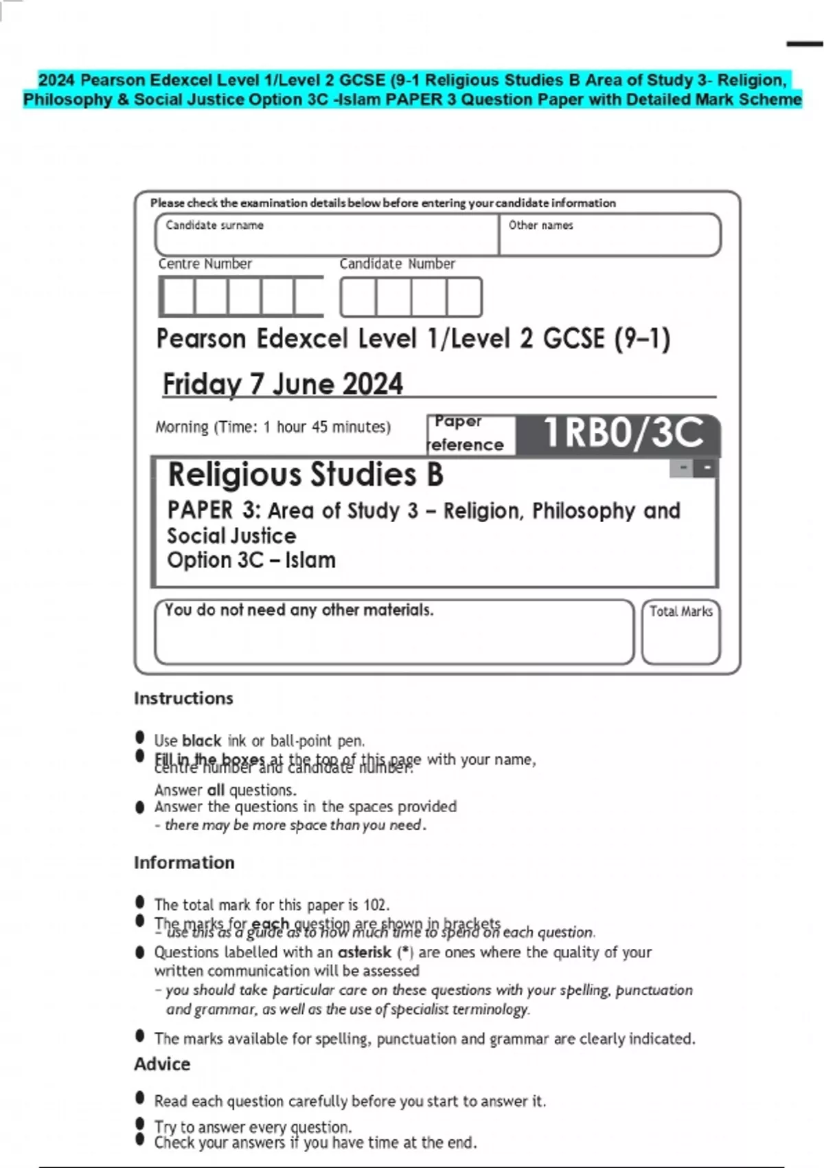 2024 Pearson Edexcel Level 1/Level 2 GCSE (9-1 Religious Studies B Area of Study 3- Religion, Philosophy & Social Justice Option 3C -Islam PAPER 3 Question Paper with Detailed Mark Scheme