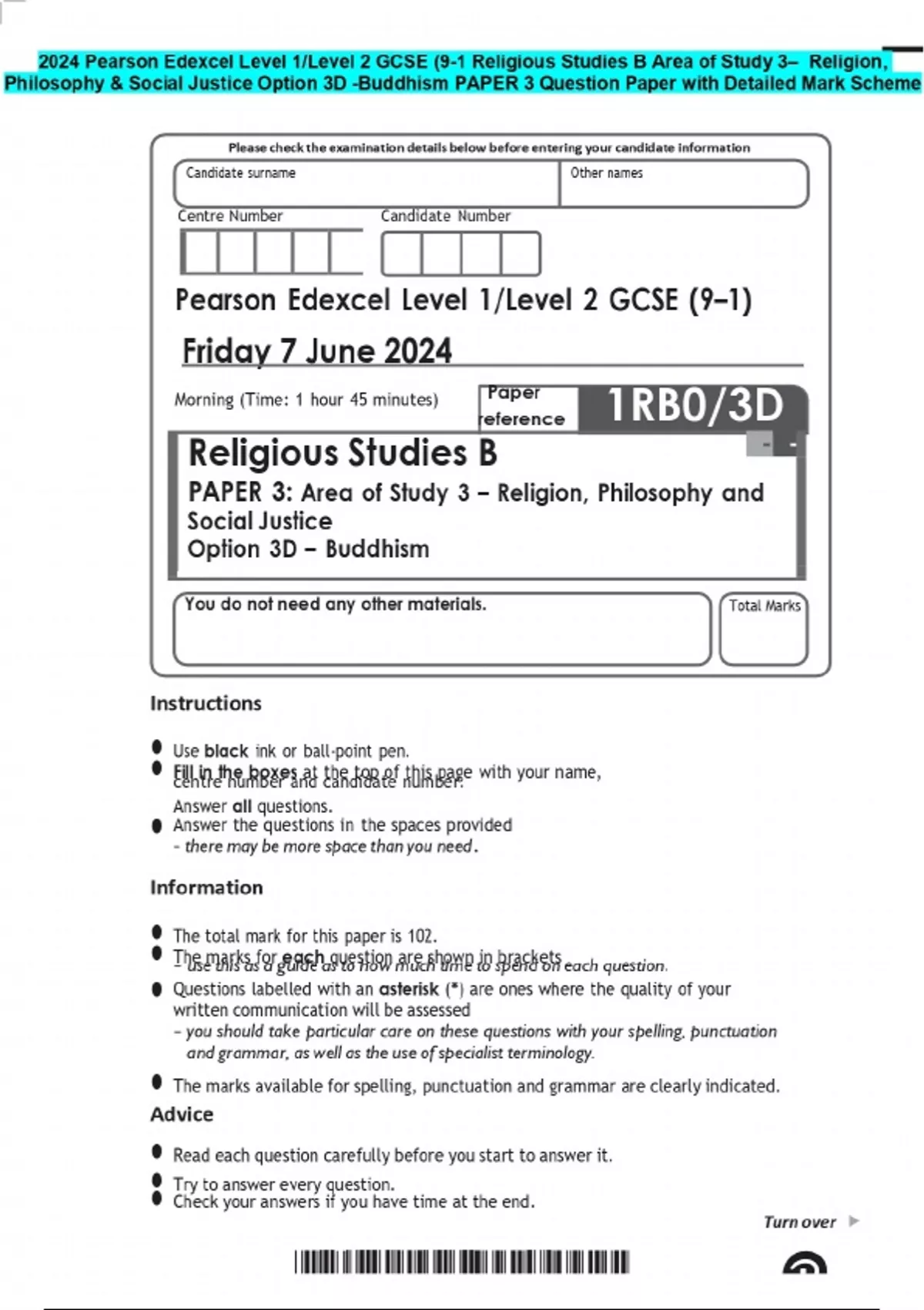 2024 Pearson Edexcel Level 1/Level 2 GCSE (9-1 Religious Studies B Area of Study 3– Religion, Philosophy & Social Justice Option 3D -Buddhism PAPER 3 Question Paper with Detailed Mark Scheme