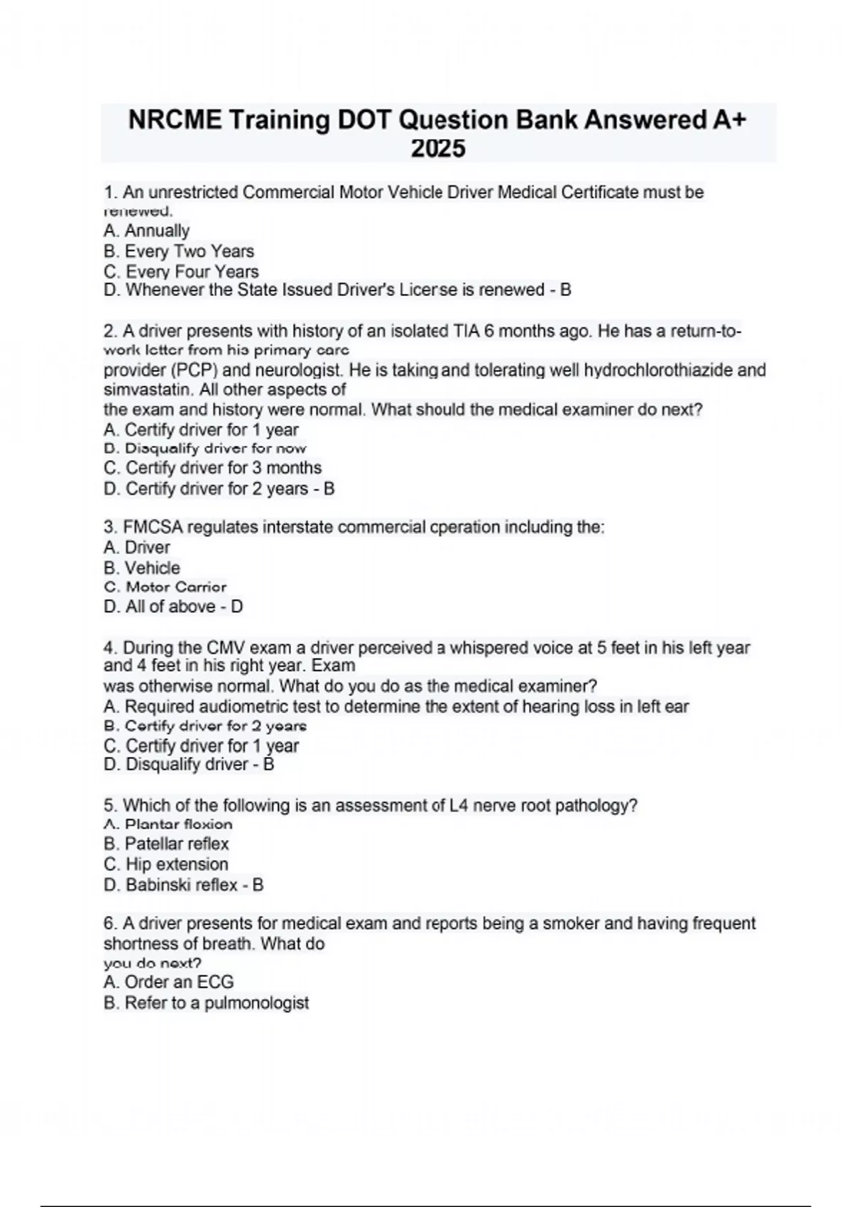 1. An unrestricted Commercial Motor Vehicle Driver Medical Certificate must be renewed: A. Annually B. Every Two Years C. Every Four Years D. Whenever the State Issued Driver's License is renewed - B 2. A driver presents with history of an isolated TIA 6 months ago. He has a return-towork letter from his primary care provider (PCP) and neurologist. He is taking and tolerating well hydrochlorothiazide and simvastatin. All other aspects of the exam and history were normal. What should the medical examiner do next? A. Certify driver for 1 year B. Disqualify driver for now C. Certify driver for 3 months D. Certify driver for 2 years - B 3. FMCSA regulates interstate commercial operation including the: A. Driver B. Vehicle C. Motor Carrier D. All of above - D 4. During the CMV exam a driver perceived a whispered voice at 5 feet in his left year and 4 feet in his right year. Exam was otherwise normal. What do you do as the medical examiner? A. Required audiometric test to determine the extent of hearing loss in left ear B. Certify driver for 2 years C. Certify driver for 1 year D. Disqualify driver - B 5. Which of the following is an assessment of L4 nerve root pathology? A. Plantar flexion B. Patellar reflex C. Hip extension D. Babinski reflex - B 6. A driver presents for medical exam and reports being a smoker and having frequent shortness of breath. What do you do next? A. Order an ECG B. Refer to a pulmonologist NRCME Training DOT Question Bank Answered A+ 2025 C. Order a spirometer test D. Provide 1 year certification - C 7. According to regulation, which of the following must be evaluated as part of the eye exam? A. Pupil reaction B. Iris symmetry C. Conjunctiva injection D. Tonometry pressure - A 8. Continued certification of NRCE Medical Examiners requires all EXCEPT which of the following? A. Periodic training at least every five years B. Completion of recertification test every five years C. Completion of certification test every 10 years D. Electronic transmission to FMCSA CMV Medical Examination Results at least monthly - B 9. A driver presents for recertification. The only condition he lists is GERD, for which he takes OTC omeprazole. He says that when he is driving and eating fast foods, he is more likely to have heartburn than when off‐duty. You should: A. Request recent UGI results B. Correlate history with abdominal exam C. Certify for one year with restricted diet D. Discuss alternative employment - B 10. Which of the following findings is disqualifying? A. Oxygen saturation 90% B. LVEF 40% C. FEV 68% predicted D. All of the above - A 11. The driver presents for recertification and submits an ultrasound report indicating an abdominal aortic aneurysm from two months ago, shortly before he had surgical correction. He has surgical clearance and says he is doing well, has no symptoms. You should: A. Certify for 1 year B. Certify for 2 years C. Inform the driver of the 3 month waiting period before he can be certified D. Inform the driver of the 6 month waiting period before he can be certified - C 12. The driver takes diphenhydramine twice a day to treat nasal congestion. What must you document in order to certify? A. Take the lowest dose effective on days when driving B. Cannot drive within 12 hours of taking diphenhydramine C. Cannot drive within 6 hours of taking diphenhydramine D. Diphenhydramine is disqualifying - B 13. The driver has a history of carpal tunnel repair of her right hand 2 months ago. Her grip strengths are symmetrical and strong. What is necessary in order to qualify this driver? A. Must first complete a 3‐month post‐op waiting period B. Document her findings for 1‐year certification C. Document her findings for 2‐year certification D. Request that an SPE be obtained before certification - C 14. Which of the following abdominal complaints is most likely to be incapacitating? A. IBS B. GERD C. Urinary tract infection D. Nephrolithiasis - D 15. The waiting period for benign positional vertigo is: A. 1 month B. 2 months C. 3 months D. 6 months - B 16. The driver's BP is 148/96. You verify her history, which indicates she has no prior history of hypertension. If otherwise qualified, you may certify her for: A. 3 months B. 6 months C. 1 year D. 2 years - C 17. The driver's current BP is 135/76. Your records indicate at history of Stage III hypertension 4 years ago. The maximum certification for this driver is: A. 3 months B. 6 months C. 1 year D. 2 years - B 18. The driver presents for examination with a recent history (five weeks ago) of pneumothorax. He has no prior history of pneumothorax. In order to be considered medically qualified, his forced vital capacity (FVC) should be greater than: A. 40% B. 55% C. 65% D. 90% - C 19. The recommended waiting period (WP) and certification period (CP) for a driver following surgical correction for intermittent claudication are: A. WP 1 month, CP 6 months B. WP 3 months, CP 1 year C. WP 3 months, CP 2 years D. WP 6 months, CP 2 years - B 20. Which of the following are disqualifying? A. Pacemaker B. Implanted defibrillator C. Both a and b D. Neither - B 21. Five years post‐CABG, the driver must provide a copy of in order to qualify for recertification A. Ultrasound B. EKG C. Lipid profile D. ETT - D 22. The driver has a 5‐year history of asthma, described as "well‐controlled". He carries rescue inhaler for the times when he becomes short of breath, but says this is rare. He provides pulmonary functions performed last week and his FEV1 is 62% of predicted and his Pa02 is 62 mm. You should: A. Qualify for 1 year B. Qualify for 2 years C. Disqualify and recommend that he return to his personal provider D. Disqualify and recommend that he pursue a chronic respiratory exemption - C 23. What is the Primary mission of FMCSA? A. To improve the quality of the highways. B. To promote the safety of the roadways. C. To regulate the performance of medical exams. D. To ensure state regulations coincide with federal regula