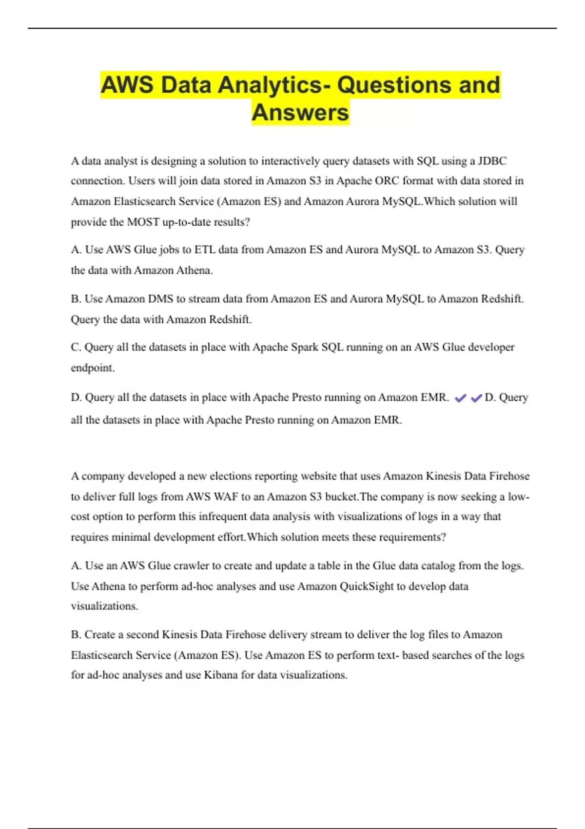 D. Query all the datasets in place with Apache Presto running on Amazon EMR. D. Query