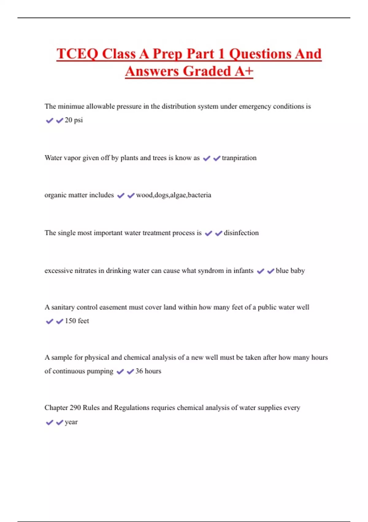 TCEQ Class A Prep Part 1 Questions And Answers Graded A+ The minimue allowable pressure in the distribution system under emergency conditions is 20 psi Water vapor given off by plants and trees is know as tranpiration organic matter includes wood,dogs,algae,bacteria The single most important water treatment process is disinfection