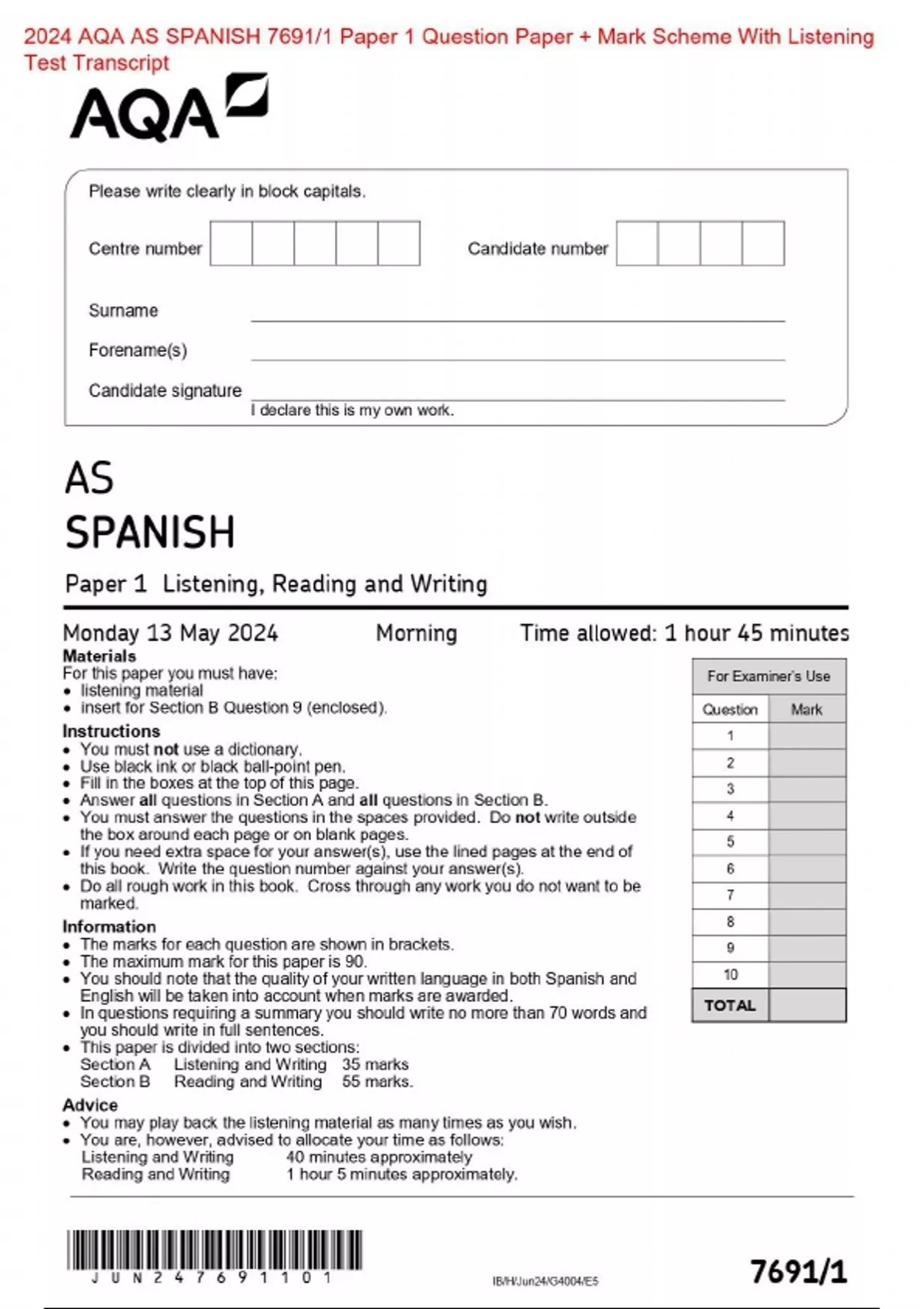 Actual 2024 AQA AS SPANISH 7691/1 Paper 1 Listening, Reading and Writing Merged Question Paper + Mark Scheme (With Listening Test Transcript)