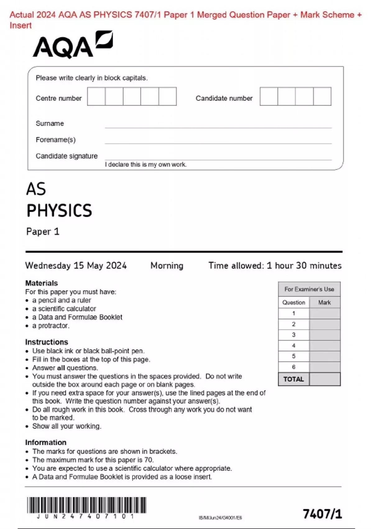 Actual 2024 AQA AS PHYSICS 7407/1 Paper 1 Merged Question Paper + Mark Scheme + Insert