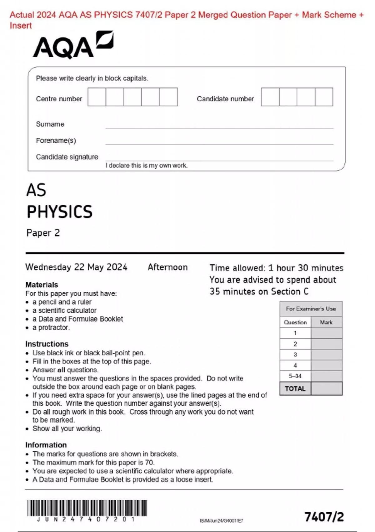 Actual 2024 AQA AS PHYSICS 7407/2 Paper 2 Merged Question Paper + Mark Scheme + Insert