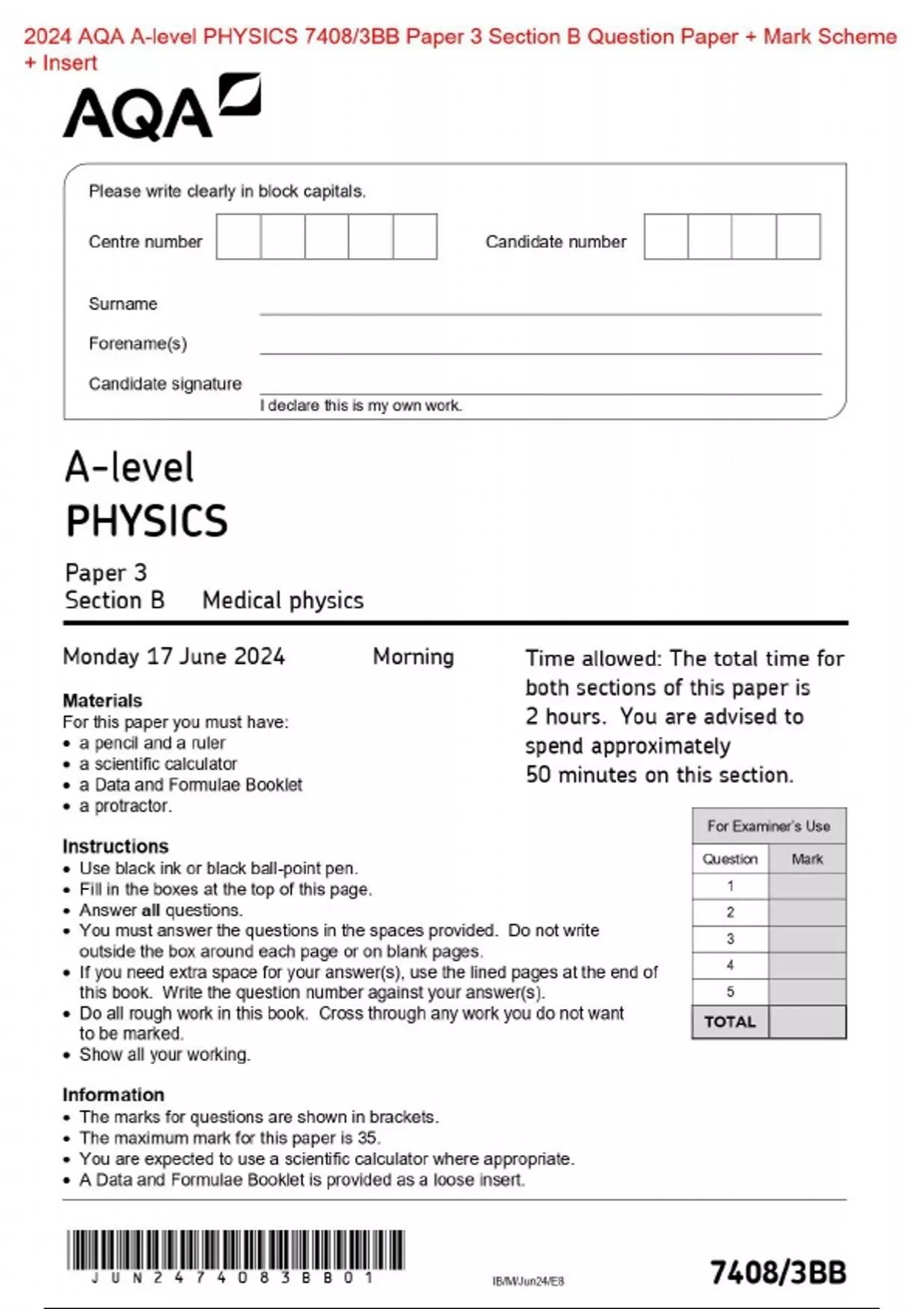Actual 2024 AQA A-level PHYSICS 7408/3BB Paper 3 Section B Medical physics Merged Question Paper + Mark Scheme + Insert