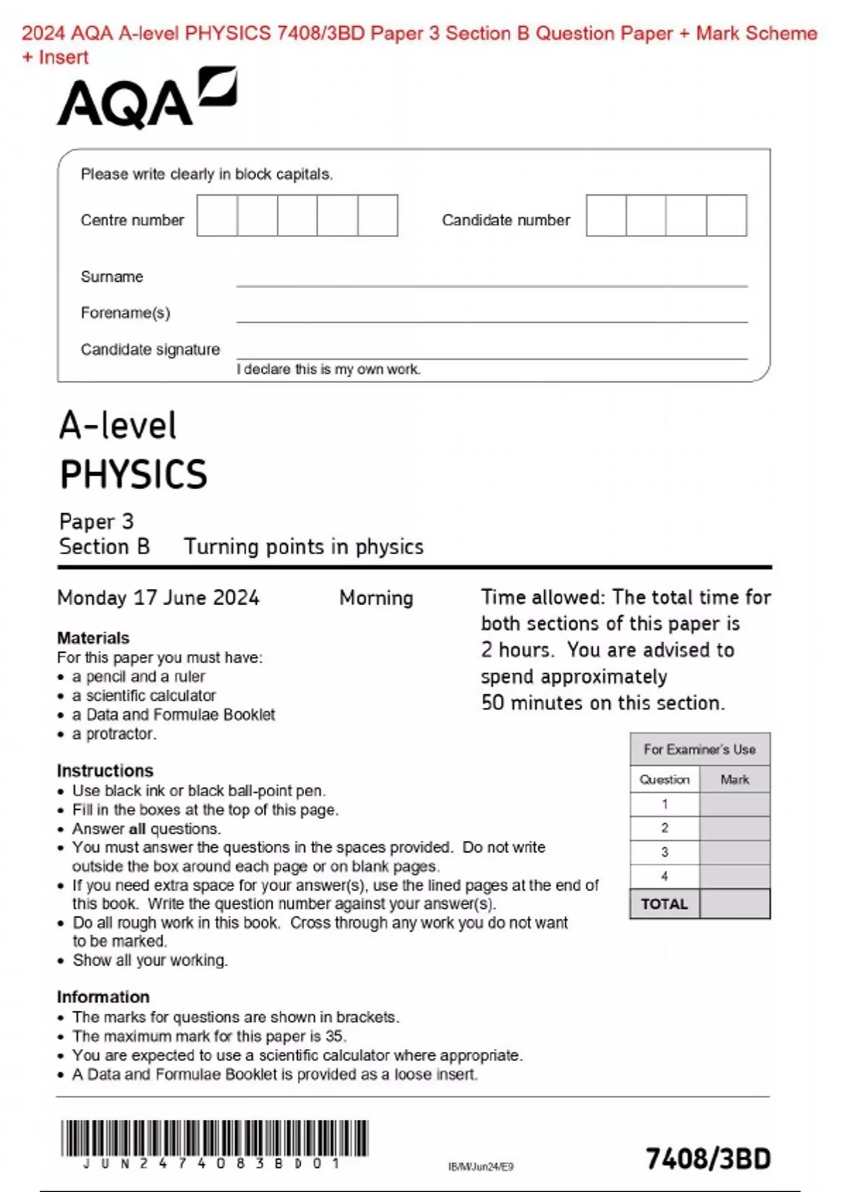 Actual 2024 AQA A-level PHYSICS 7408/3BD Paper 3 Section B Turning points in physics Merged Question Paper + Mark Scheme + Insert