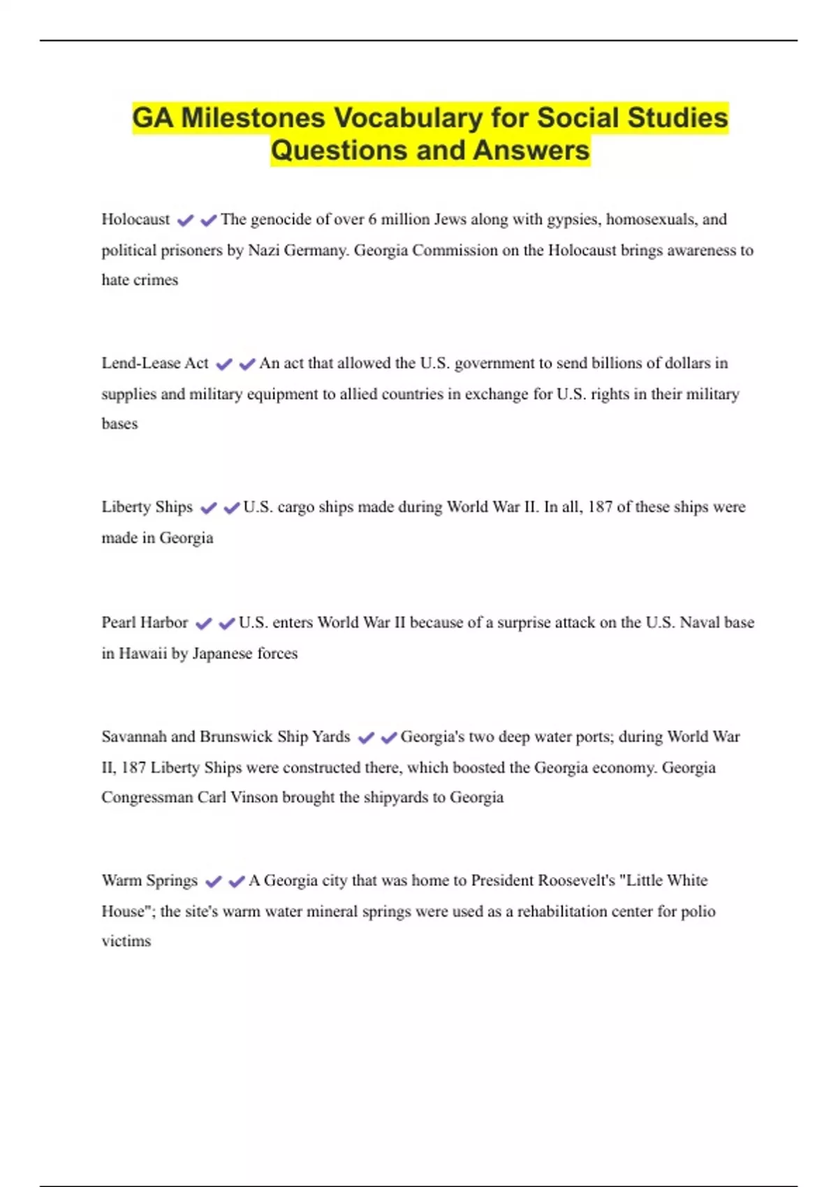 GA Milestones Vocabulary for Social Studies Questions and Answers