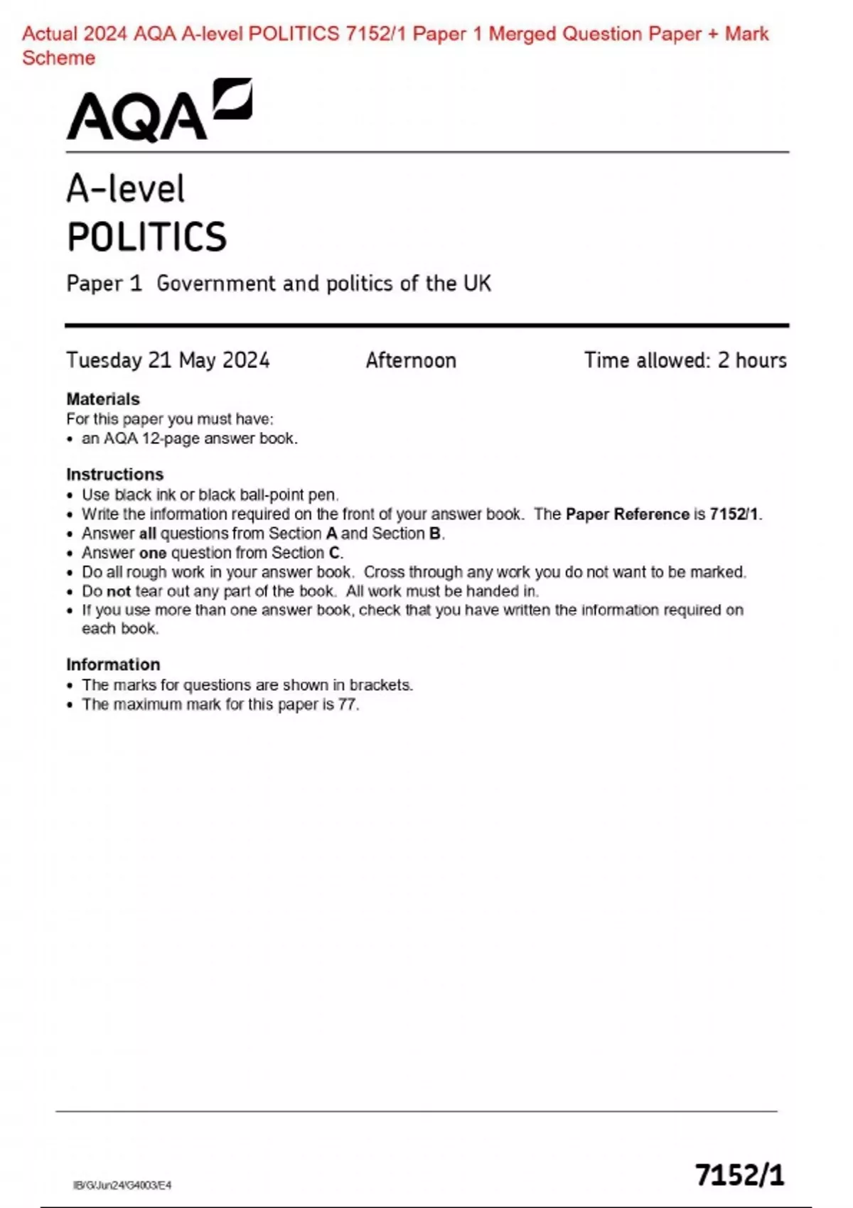 Actual 2024 AQA A-level POLITICS 7152/1 Paper 1 Government and politics of the UK Merged Question Paper + Mark Scheme