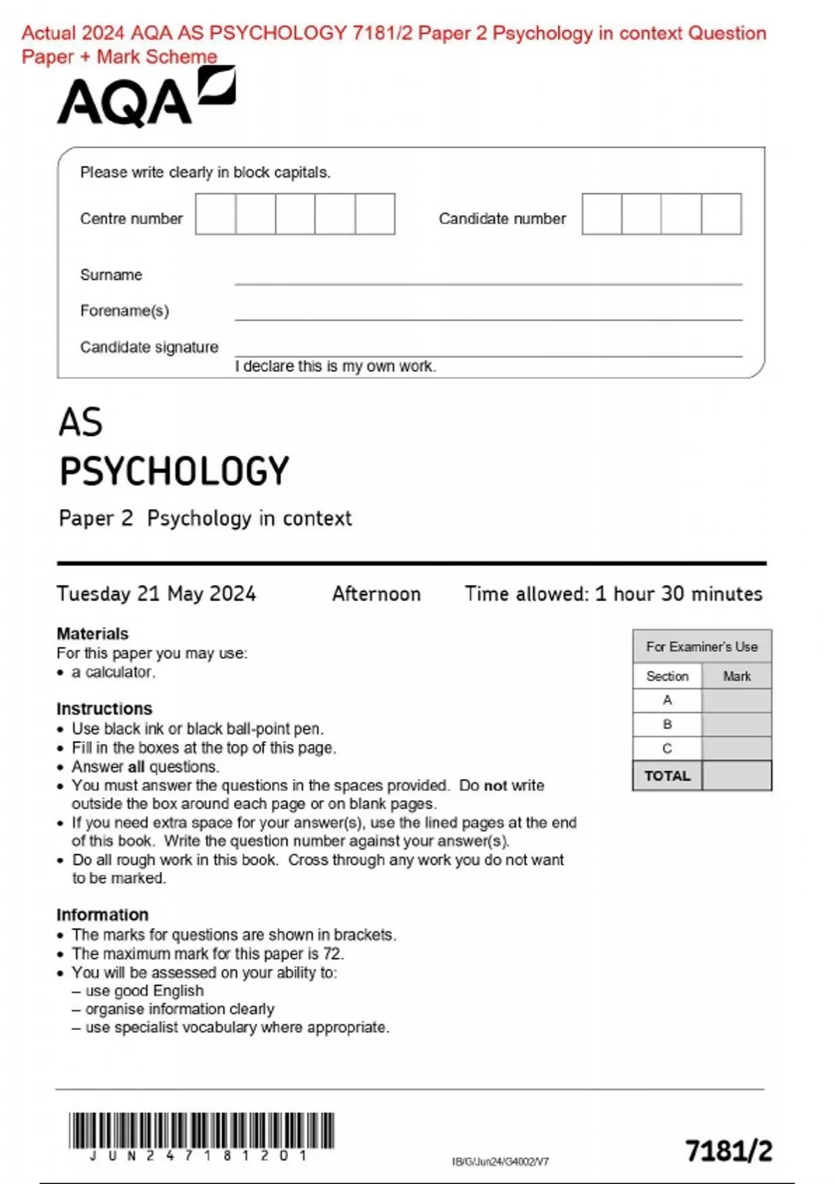 Actual 2024 AQA AS PSYCHOLOGY 7181/2 Paper 2 Psychology in context Merged Question Paper + Mark Scheme