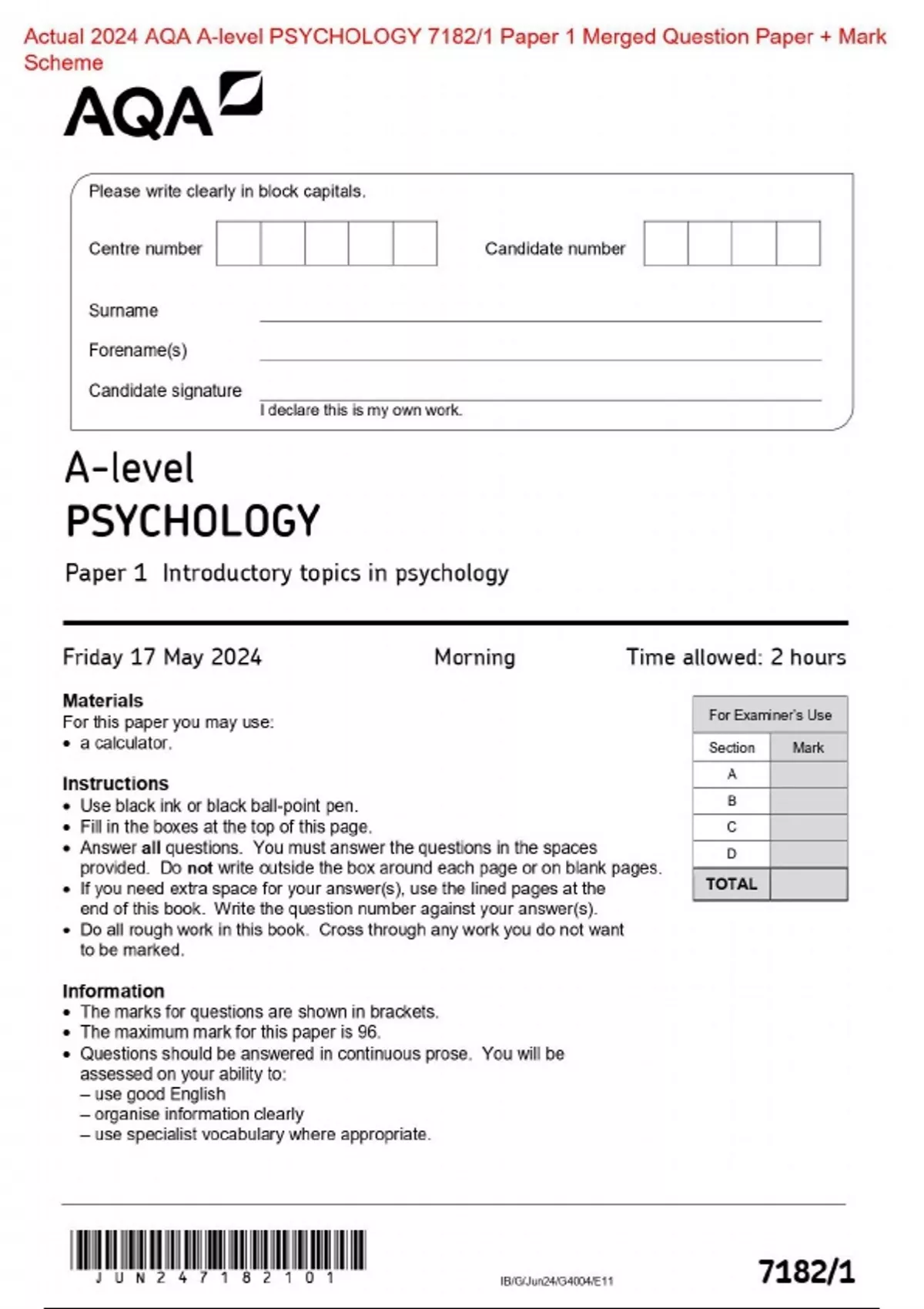 Actual 2024 AQA A-level PSYCHOLOGY 7182/1 Paper 1 Introductory topics in psychology Merged Question Paper + Mark Scheme