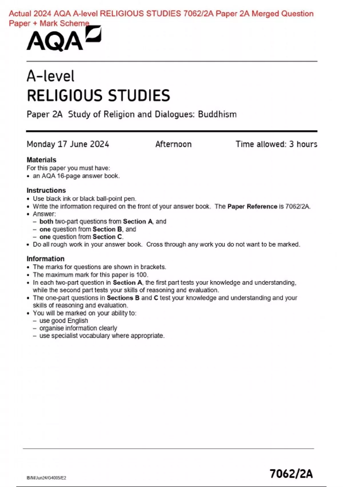 Actual 2024 AQA A-level RELIGIOUS STUDIES 7062/2A Paper 2A Study of Religion and Dialogues: Buddhism Merged Question Paper + Mark Scheme