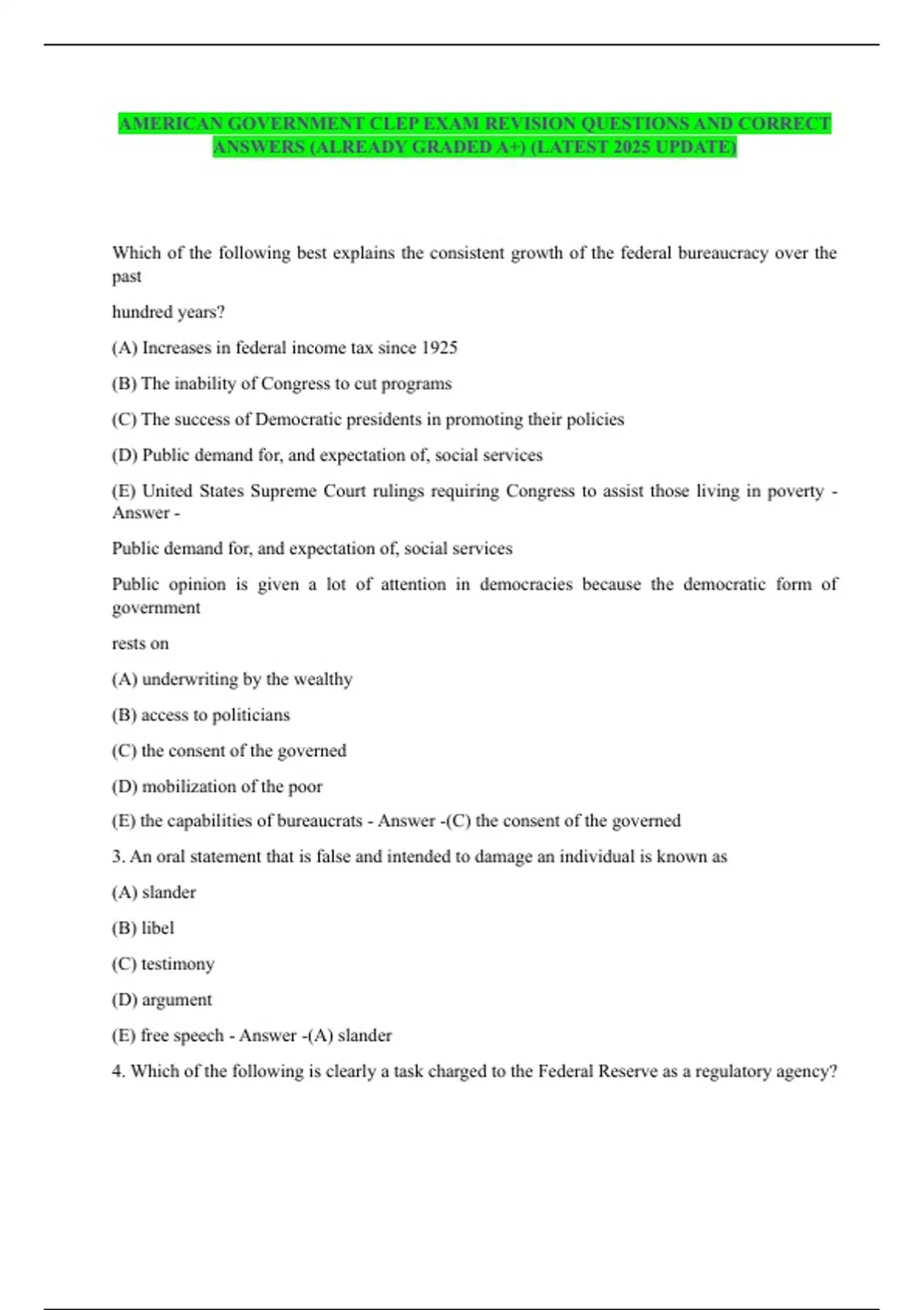 AMERICAN GOVERNMENT CLEP EXAM REVISION QUESTIONS AND CORRECT