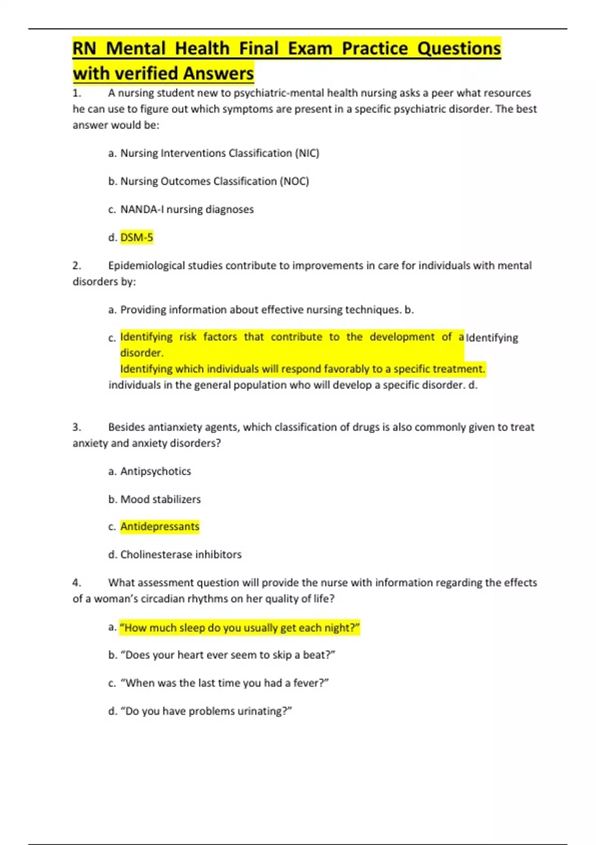 ,RN Mental Health Final Exam Practice Questions